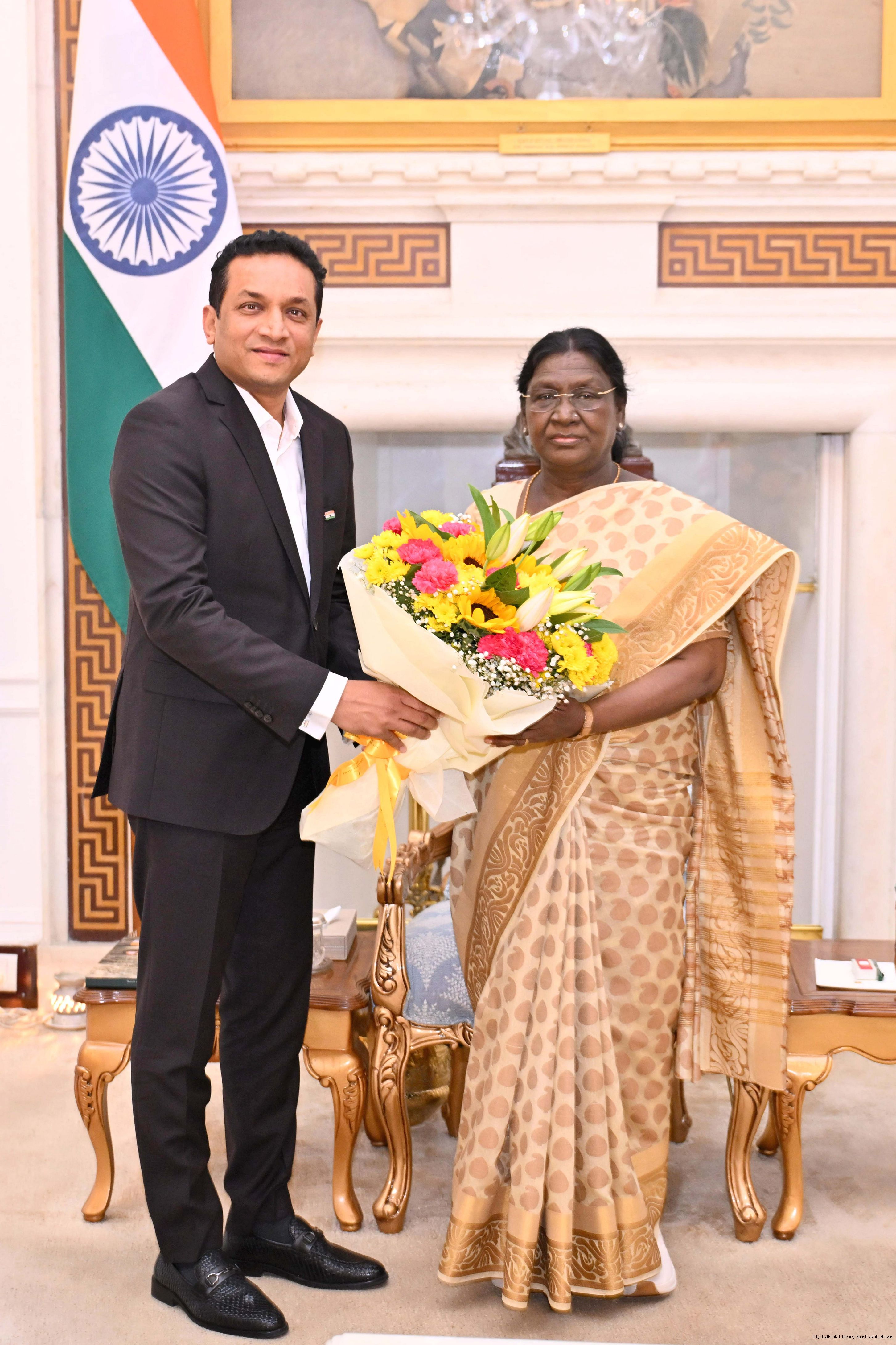 Captain Ishwar Dholakia, Founder Managing Director, Goldi Solar along with Shri Rakesh H Dudhat meeting with the President of India, Smt Droupadi Murmu at Rashtrapati Bhavan on March 25, 2026.