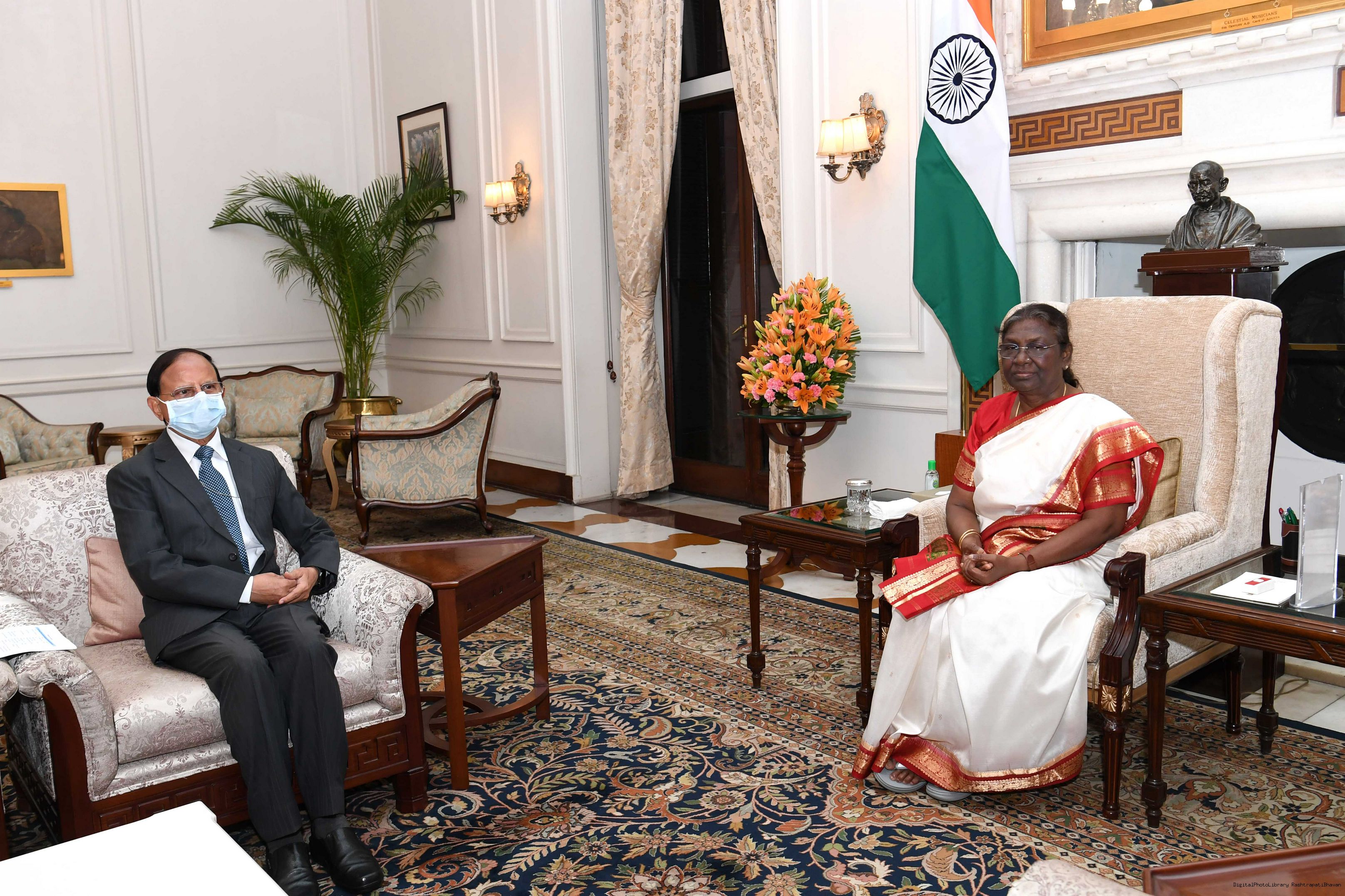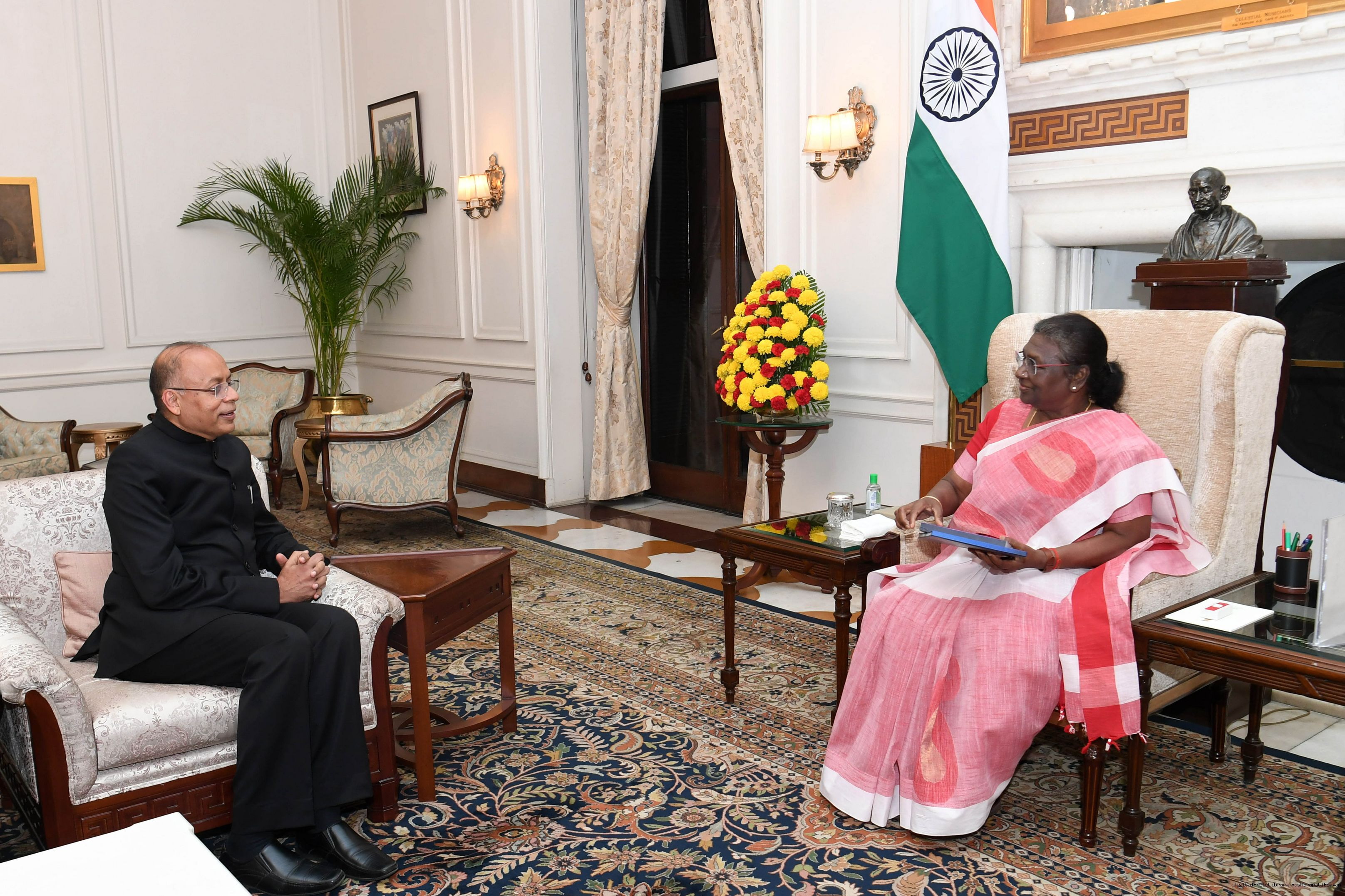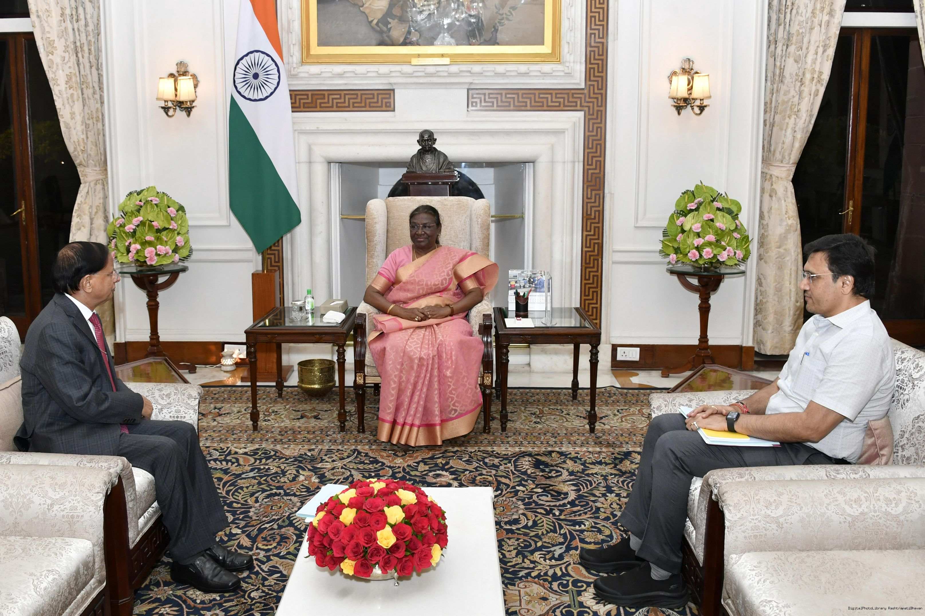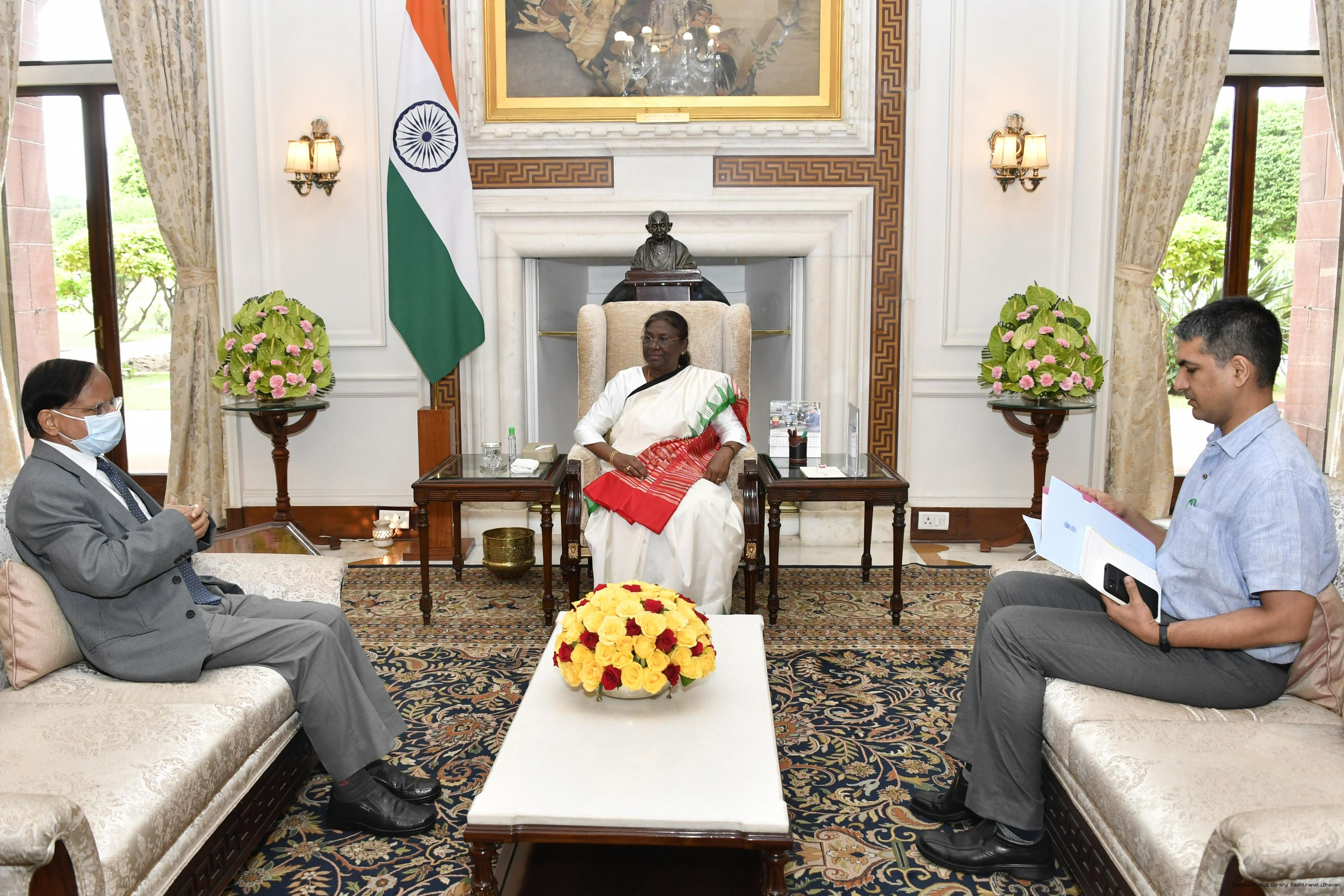 Dr. P.K. Mishra, Principal Secretary to the Prime Minister along with Shri Hardik Shah, Private Secretary to the Prime Minister meeting with the President of India, Smt. Droupadi Murmu, at Rashtrapati Bhavan on Sep 16, 2022.
