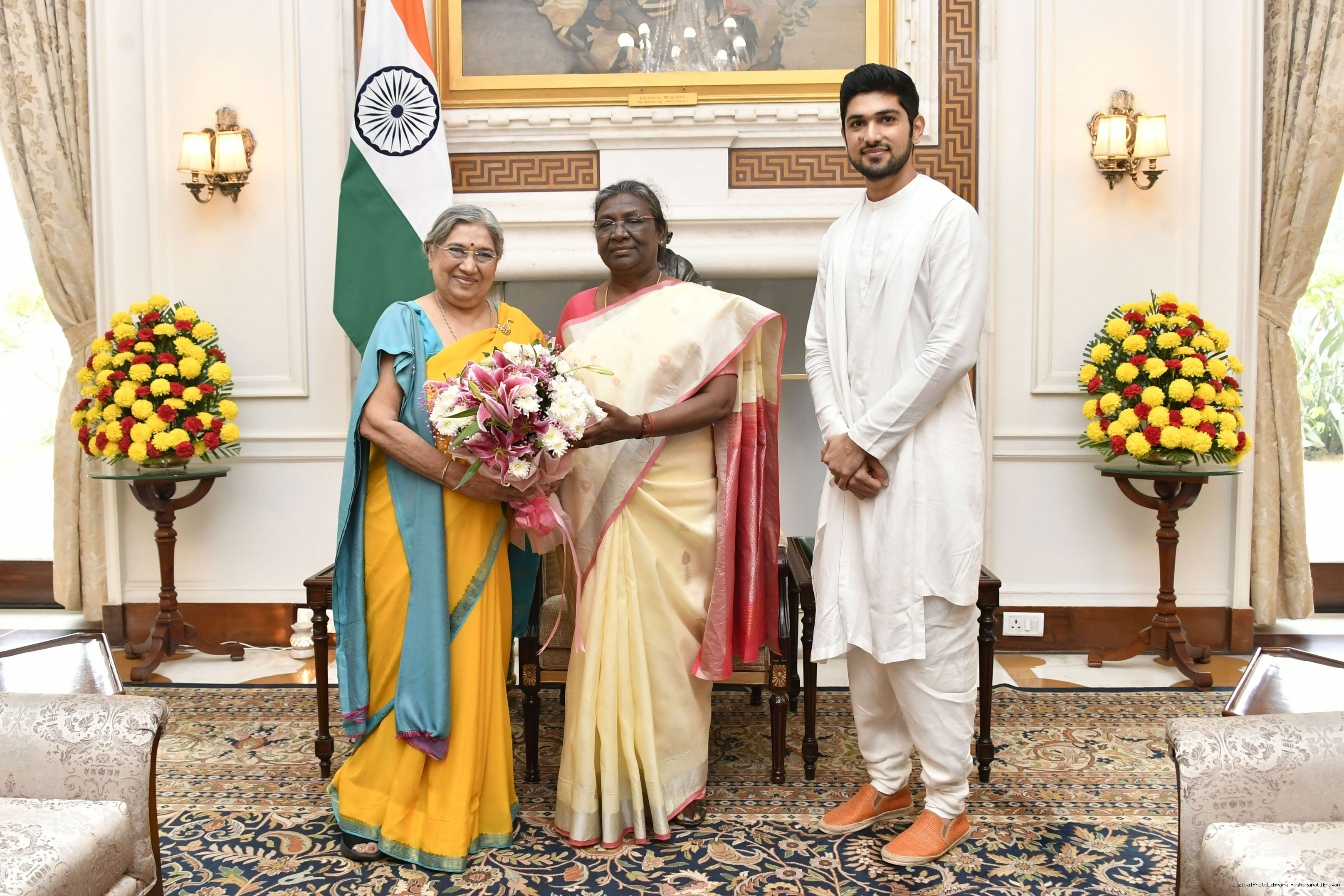 Dr. Hansaji Yogendra, Director, The Yoga Institute, Mumbai along with her son meeting with the President of India, Smt. Droupadi Murmu, at Rashtrapati Bhavan on Oct 31, 2022.