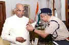 Dr. G.C. Misra, Director with others from Delhi Fire Service pinning the Fire Service Flag on the President of India, Shri Ram Nath Kovind, on the occasion of Fire Service Week, at Rashtrapati Bhavan on April 16, 2018.