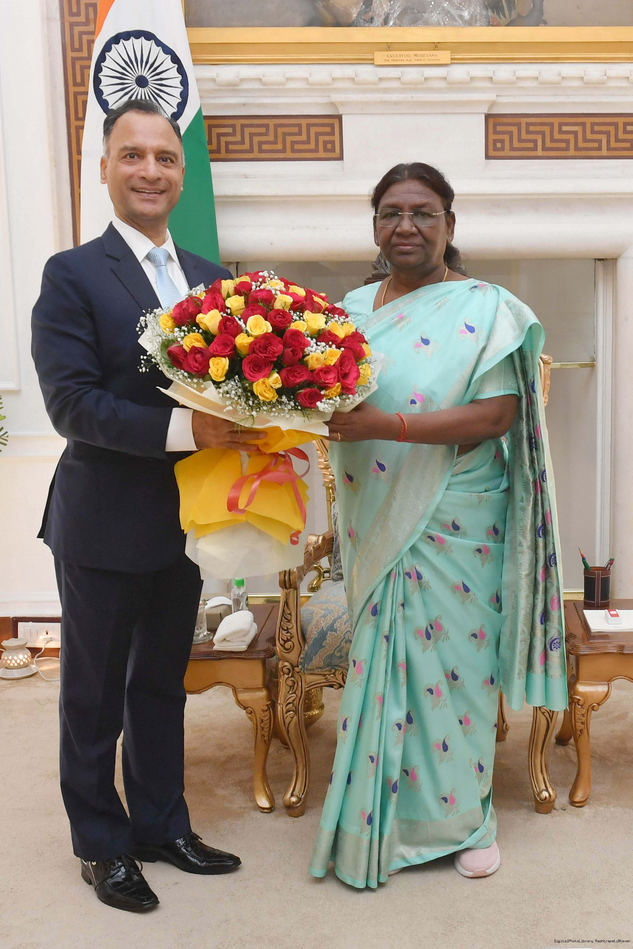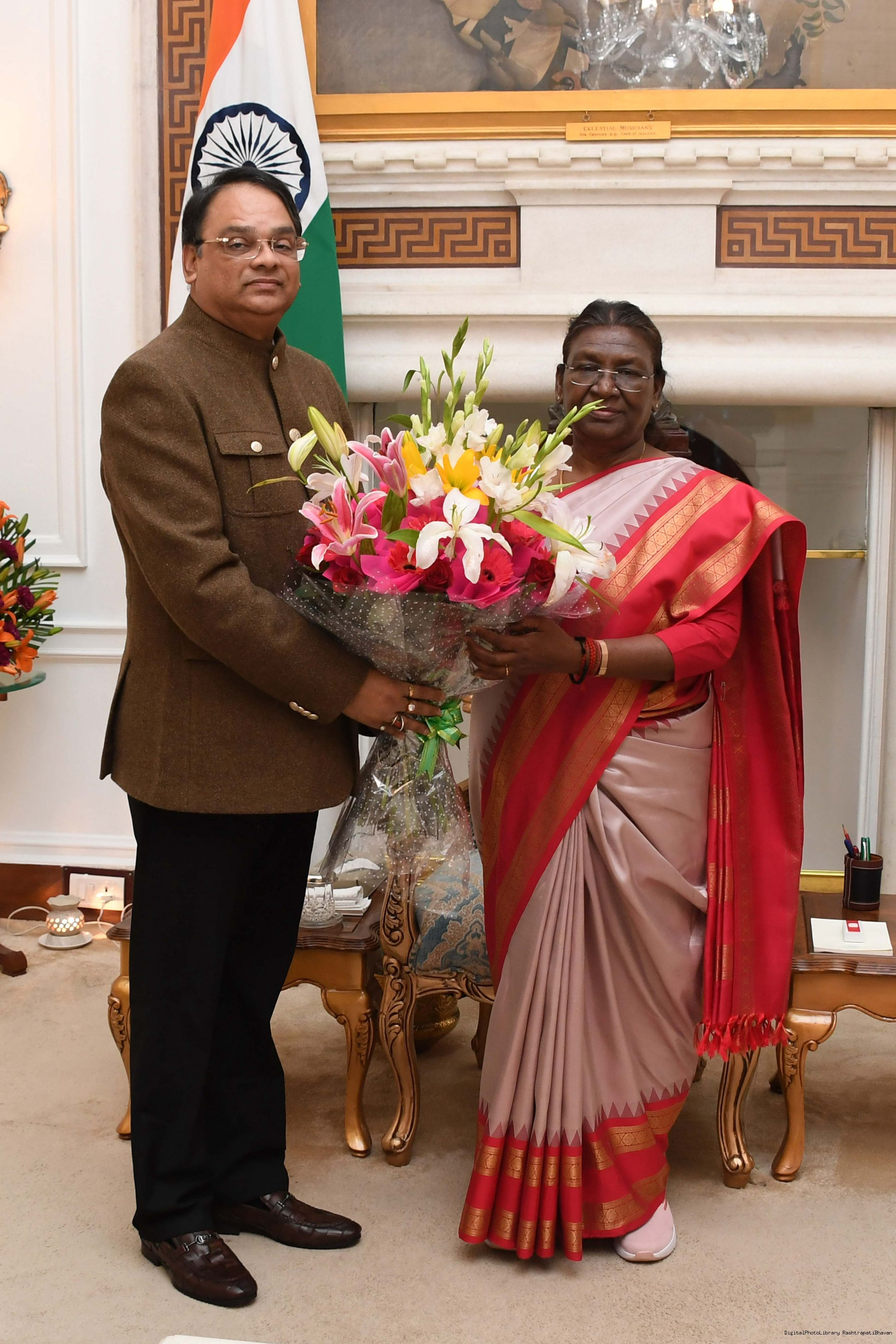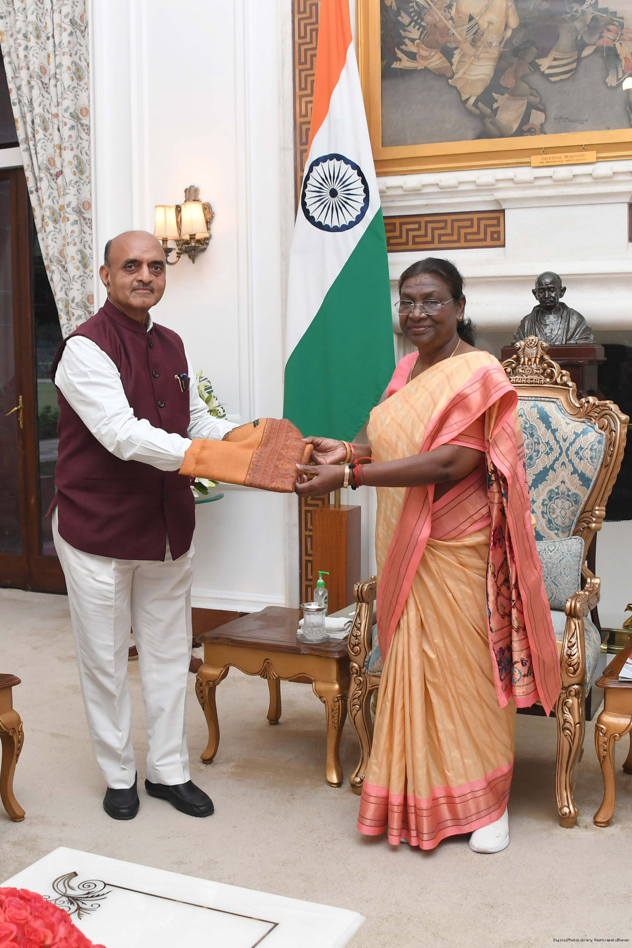 Dr. Vijay Dev State Election Commissioner Delhi and Chandigarh meeting with the President of India, Smt. Droupadi Murmu at Rashtrapati Bhavan on September 29, 2023.