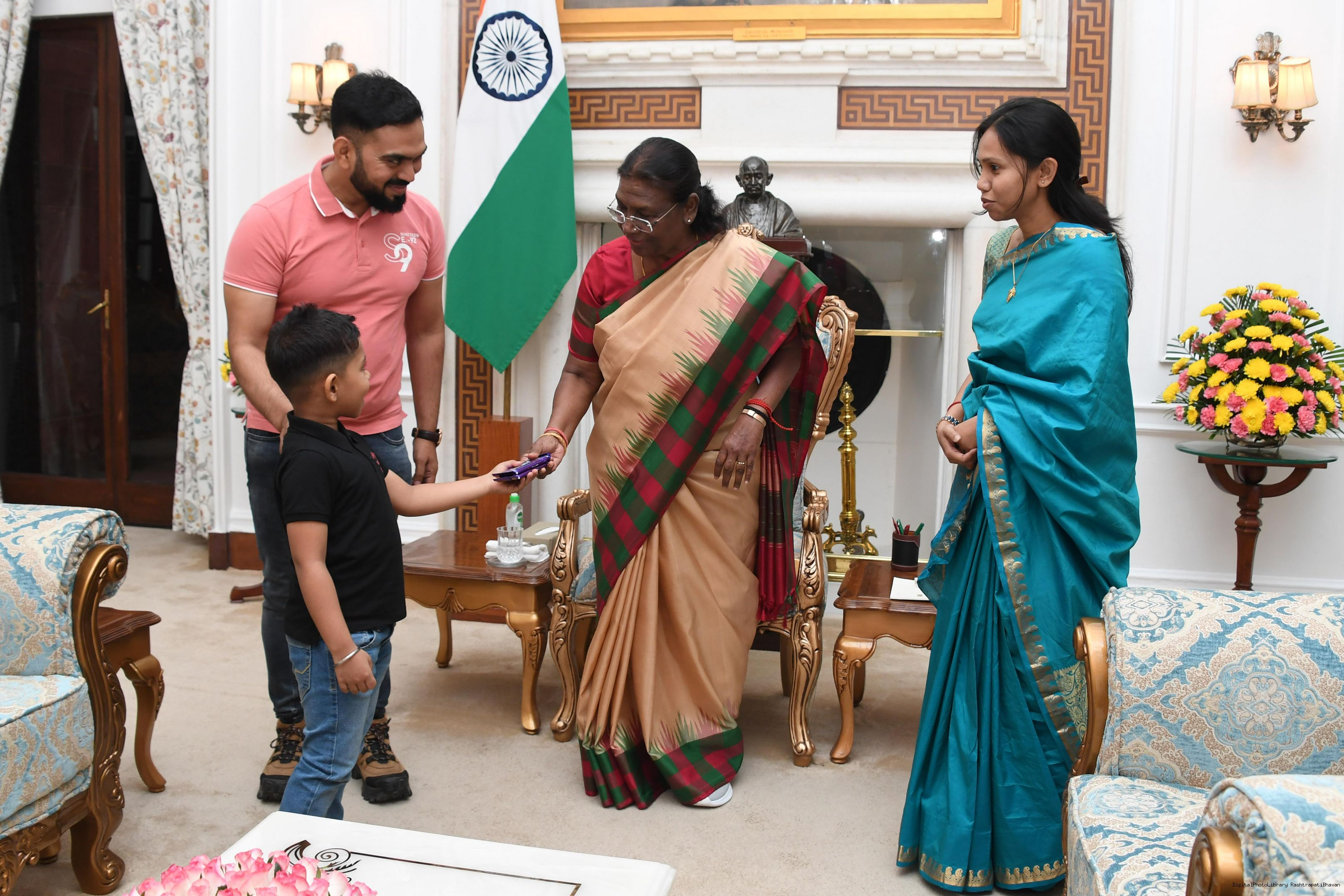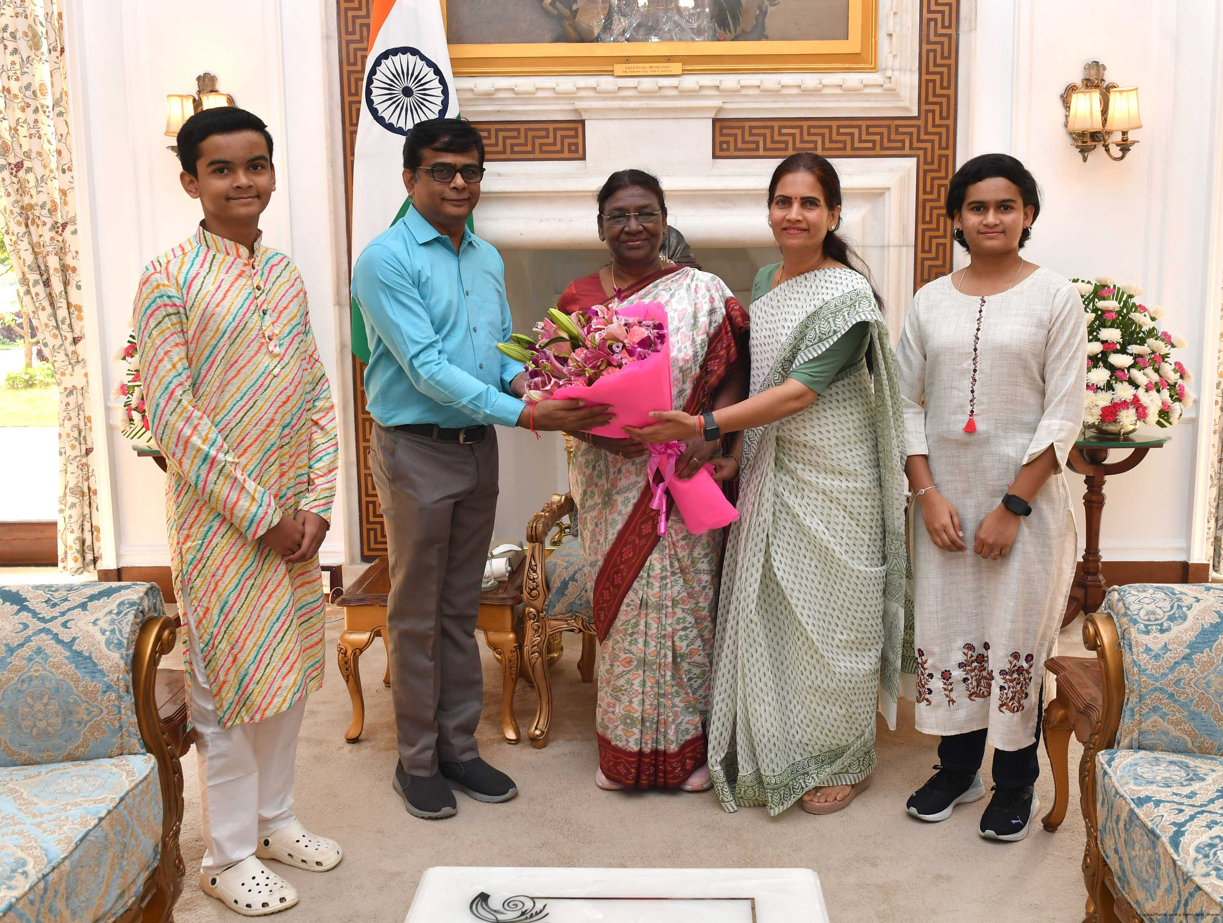 Dr. Manoranjan Rout, Paediatrics Specialist, BMC Hospital, Bhubaneswar along with his family members meeting with the President of India, Smt. Droupadi Murmu at Rashtrapati Bhavan on October 25, 2023