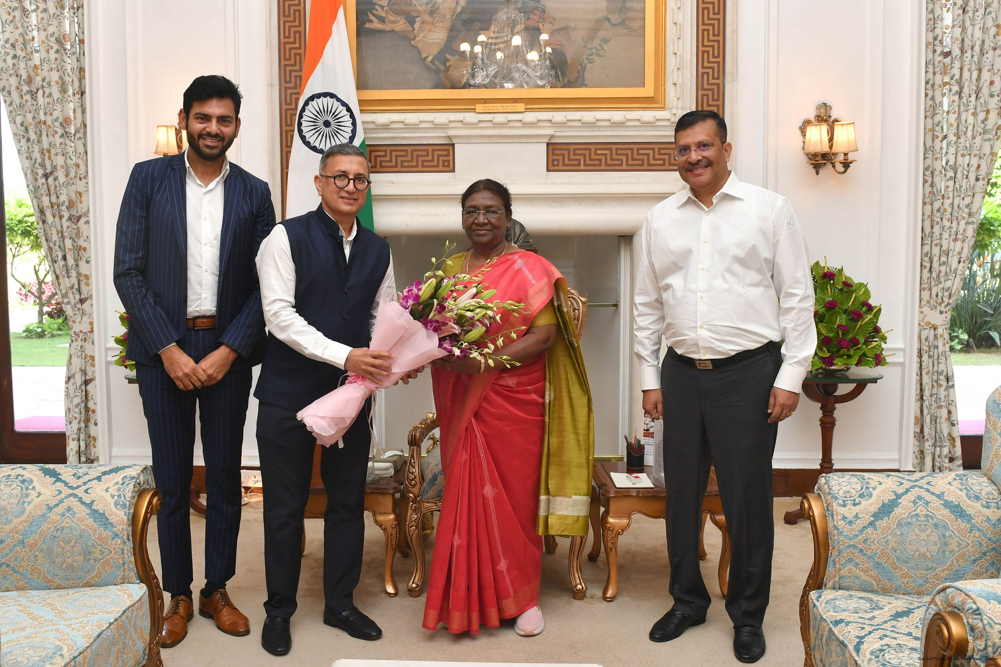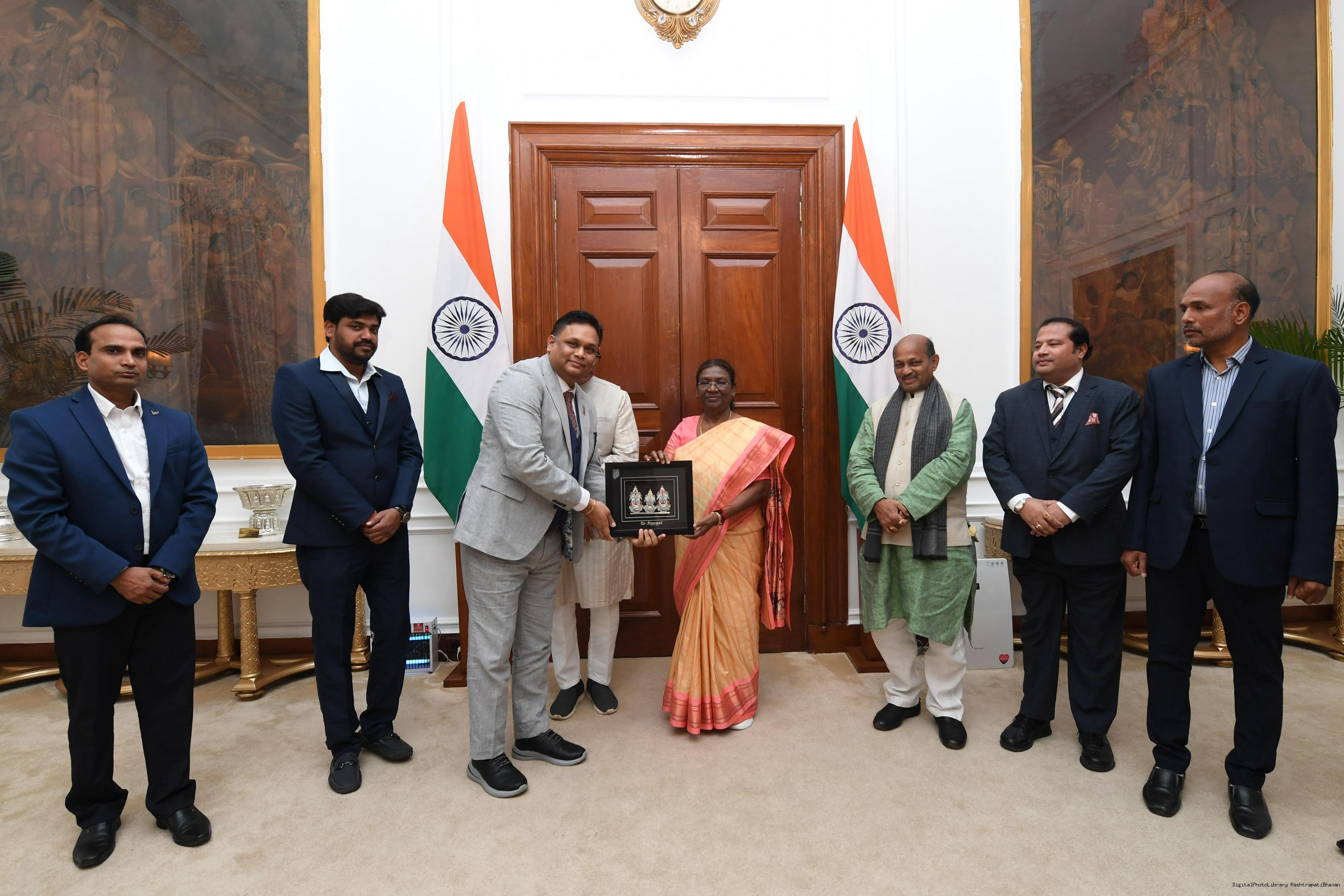 Dr. Ranjan Pai, President, Manipal Academy of Higher Education along with others meeting with the President of India, Smt. Droupadi Murmu at Rashtrapati Bhavan on September 21, 2023.