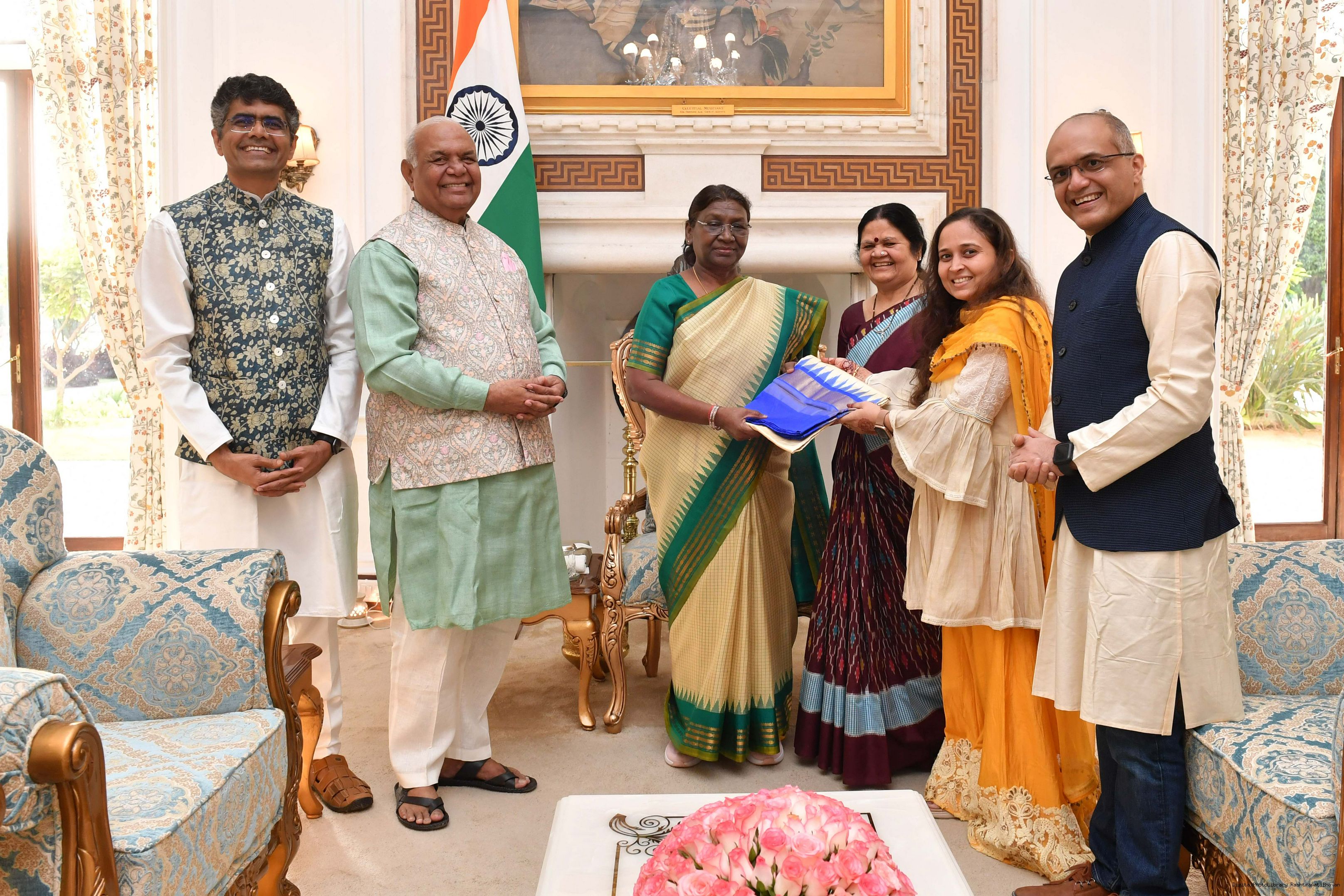 Dr. Jitubhai (Jitendra) C. Shah from Surat along with others meeting with the President of India, Smt Droupadi Murmu at Rashtrapati Bhavan on October 16, 2023