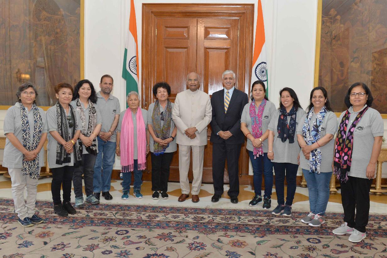 Ms. Bachendri Pal, Chief, Tata Steel Adventure Foundation, Jamshedpur with others meeting with the President of India, Shri Ram Nath Kovind, at Rashtrapati Bhavan on April 12, 2019.
