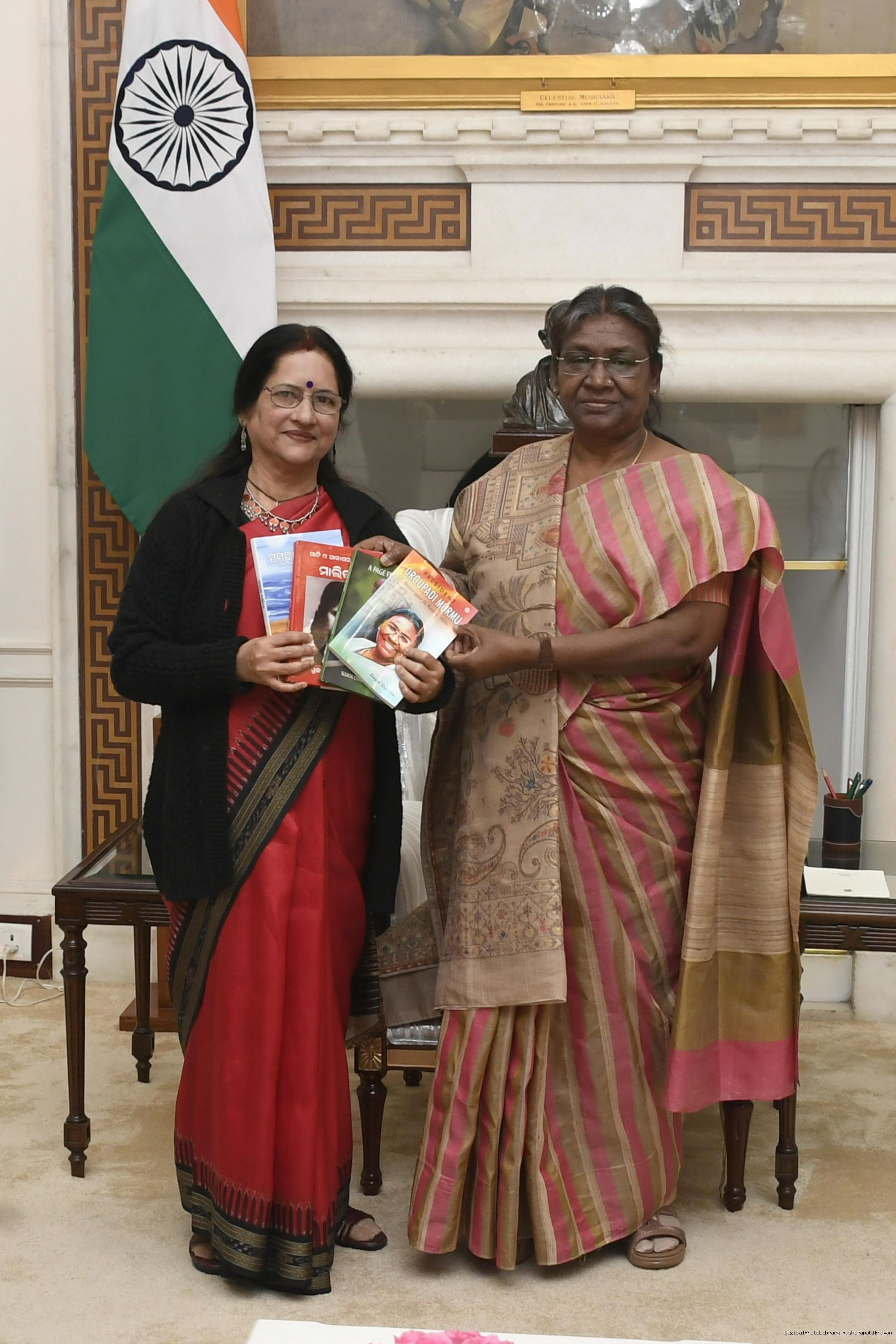 Ms. Sujata Chaudhry, former Chief Post Master General, Jharkhand and Vice President, Delhi Odia Lekhika Sansad meeting with the President of India Smt. Droupadi Murmu at Rashtrapati Bhavan on February 04, 2023.