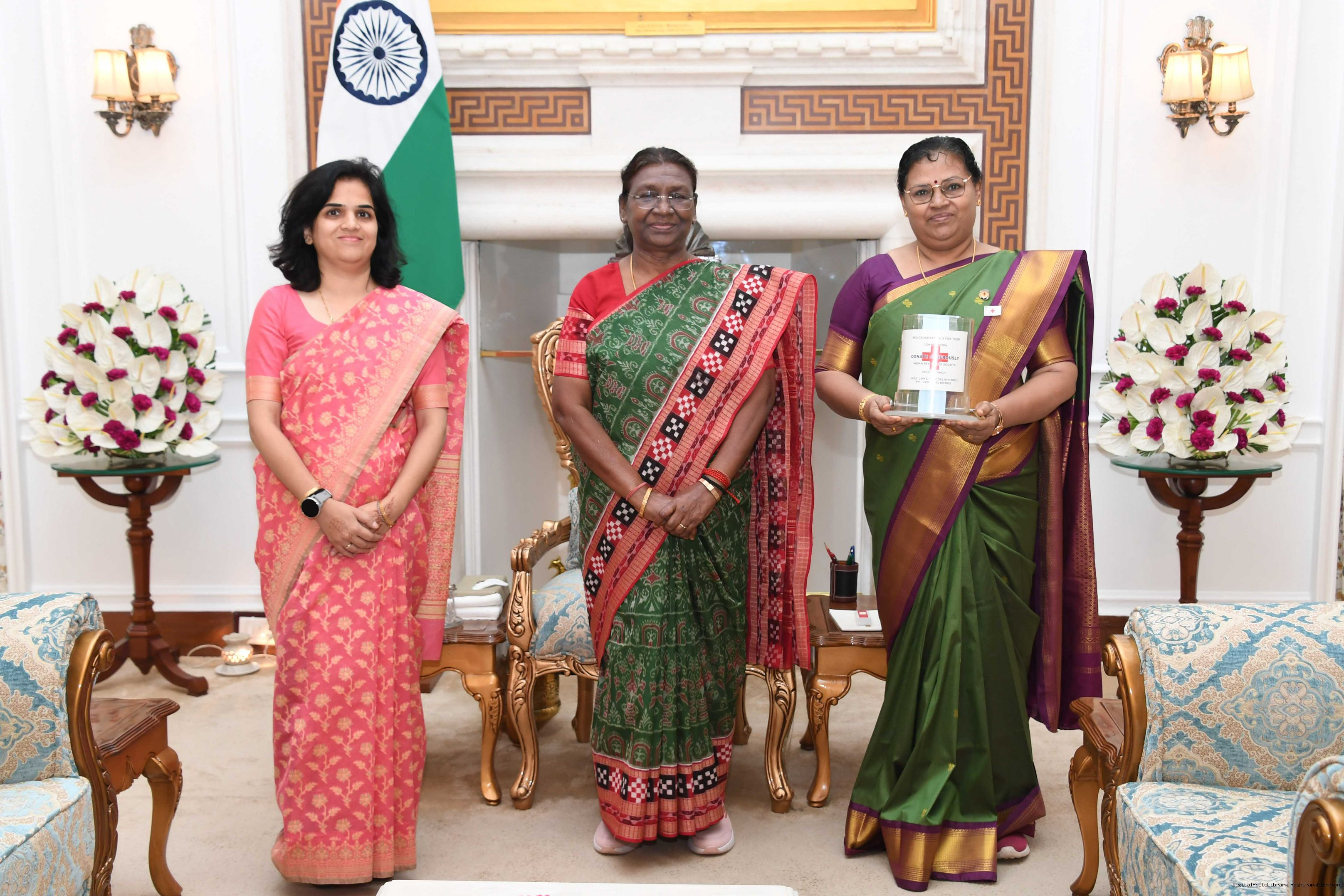 Ms. Isha Khosla, IAS, Secretary and Ms. Seena Jose, Treasurer, Indian Red Cross Society, Delhi Branch meeting with the President of India Smt. Droupadi Murmu at Rashtrapati Bhavan on November 6, 2023.