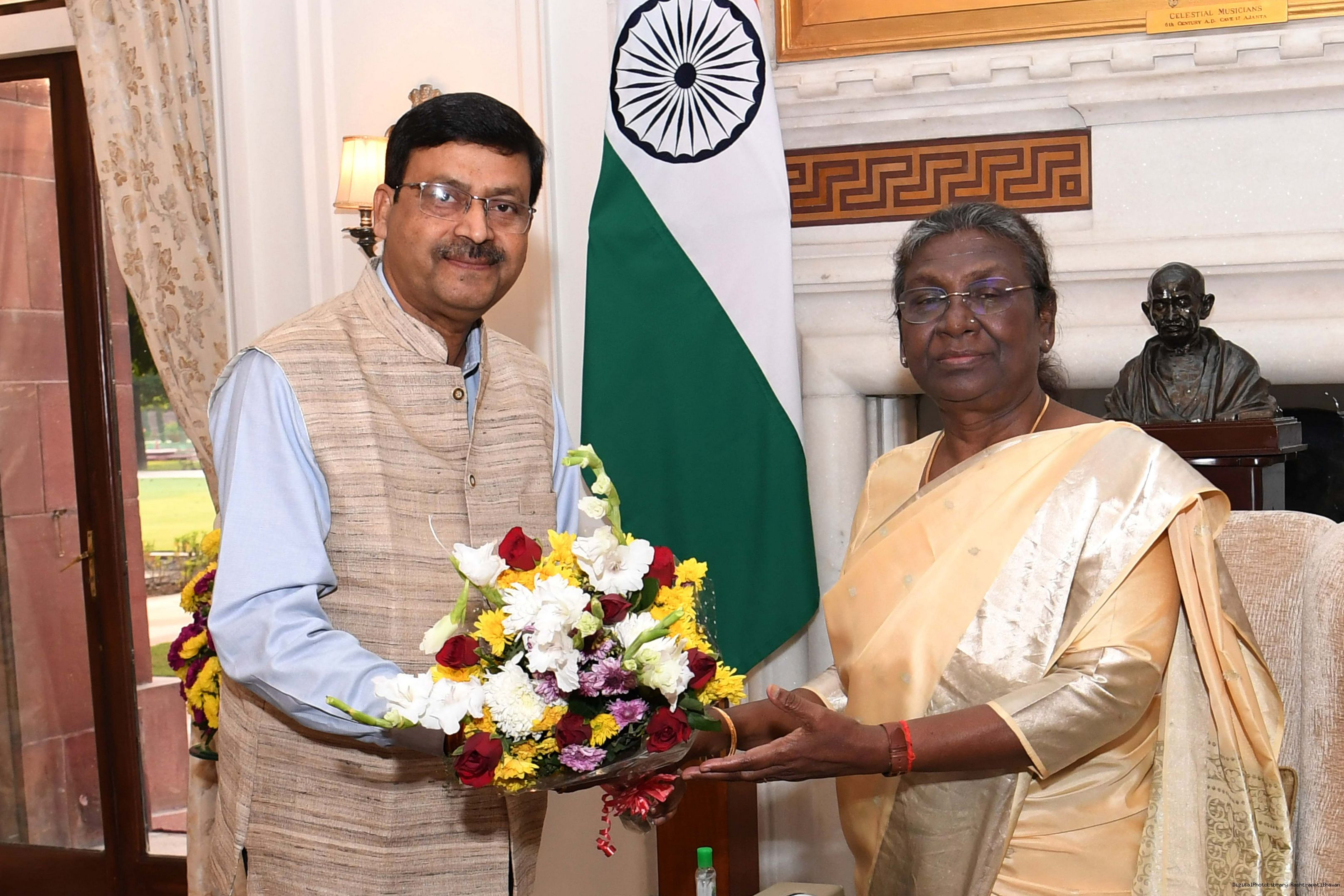 Prof. Rajaneesh Kumar Shukla, Vice-Chancellor, Mahatma Gandhi Antarashtriya Hindi Vishwavidyalaya, Wardha meeting with the President of India, Smt. Droupadi Murmu, at Rashtrapati Bhavan on Sep 02, 2022.
