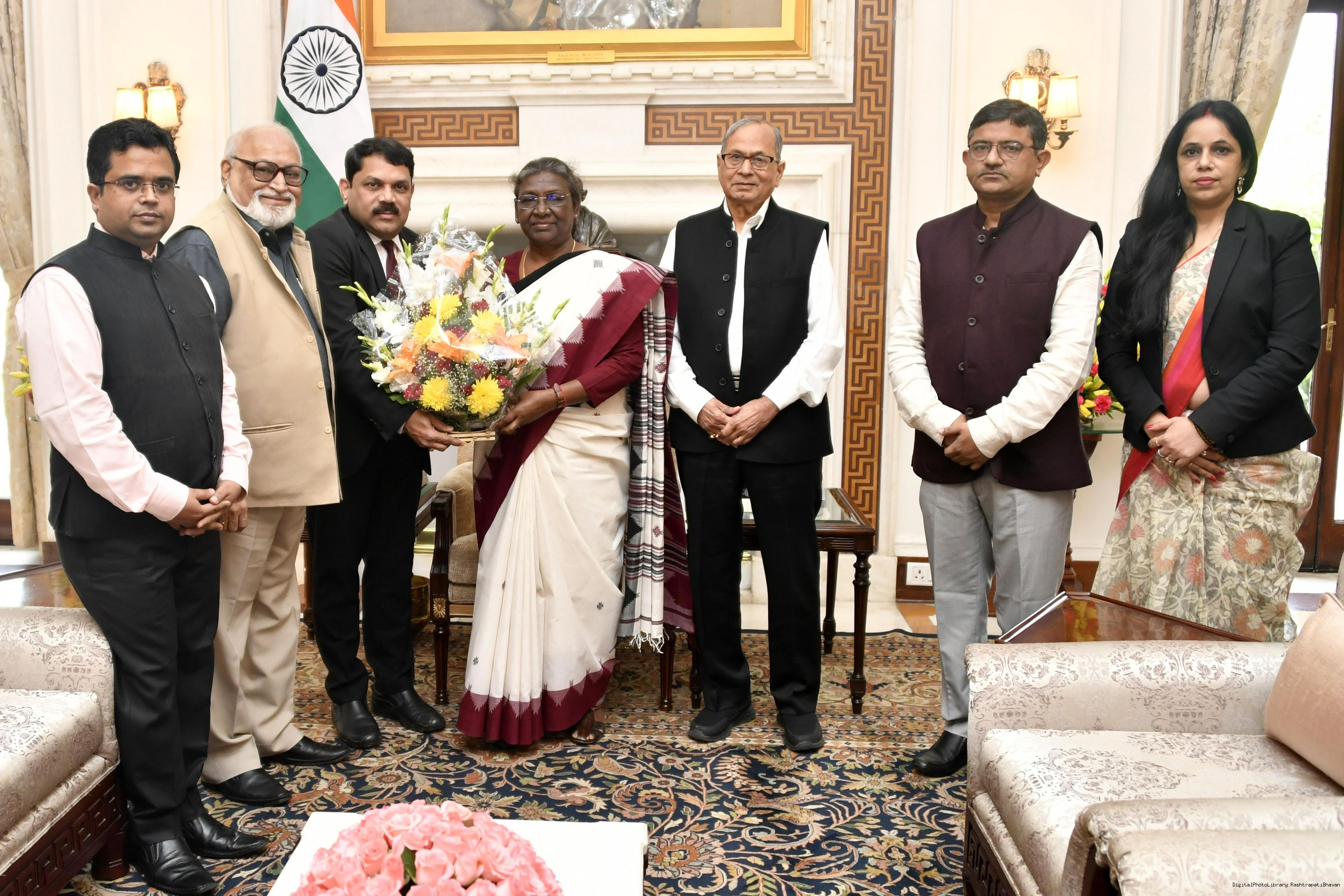 Prof. Devi Prasad Dwivedi along with his son Shri Vishrut Dwivedi meeting with the President of India, Smt. Droupadi Murmu, at Rashtrapati Bhavan on Sep 23, 2022.