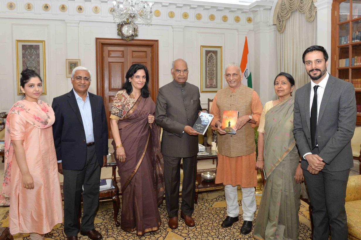 Sri M (Sri Mumtaz Ali Khan) along with his family member and others from the Satsang Foundation presenting a copy of his book 'Apprenticed to a Himalayan Master (A Yogi's Autobiography) to the President of India, Shri Ram Nath Kovind, at Rashtrapati Bhavan on May 19, 2018.
