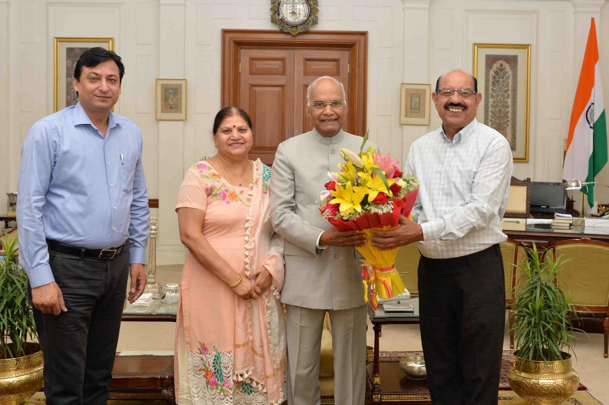 Shri Ajeet Bajaj along with his wife Smt. Shelly Bajaj and daughter Ms. Deeya Bajaj meeting with the President of India, Shri Ram Nath Kovind, at Rashtrapati Bhavan on June 01, 2018.