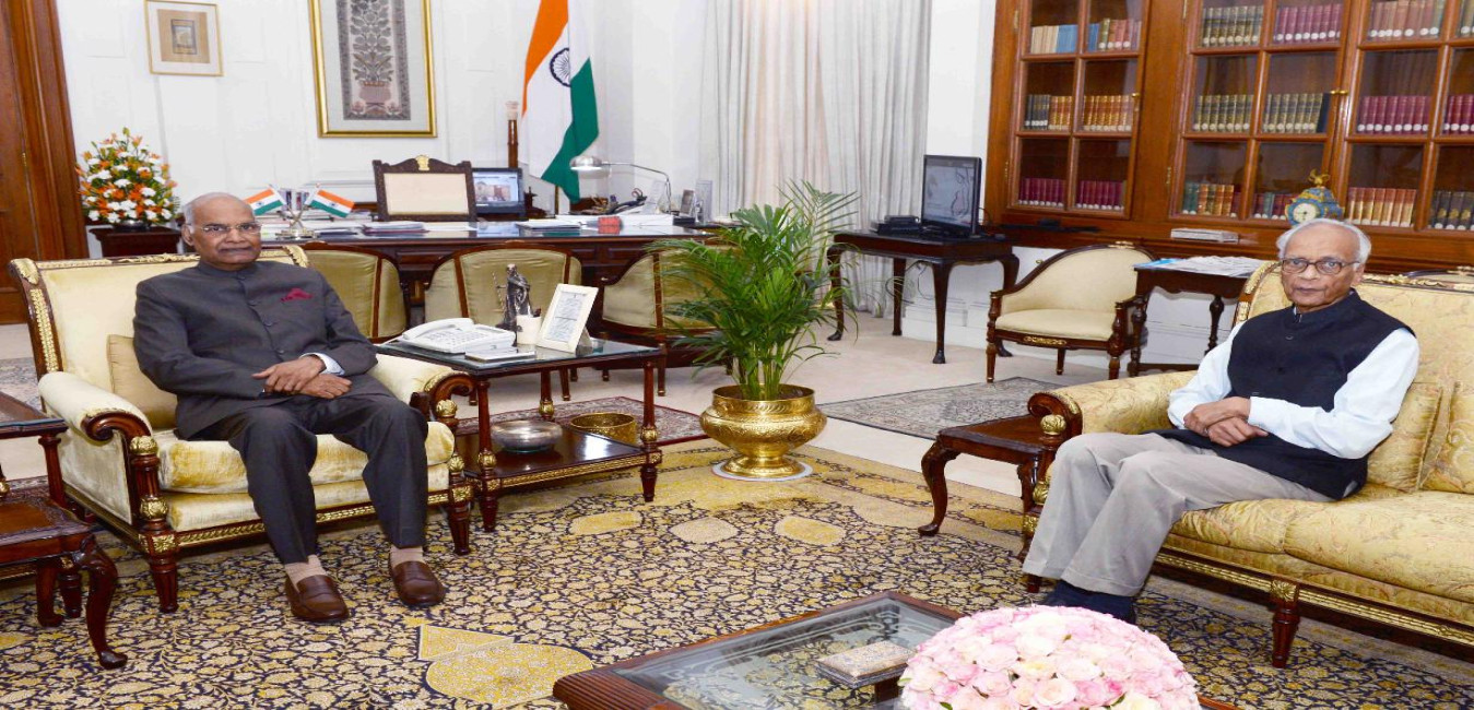 Shri D.P. Sinha from Sanskar Bharti meeting with the President of India, Shri Ram Nath Kovind, at Rashtrapati Bhavan on April 25, 2018.