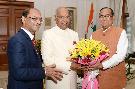 Shri Gaurishankar Agrawal, Speaker and Shri Chandra Shekhar Gangrade, Secretary, Chhattisgarh Legislative Assembly, Raipur meeting with the President of India, Shri Ram Nath Kovind, at Rashtrapati Bhavan on April 16, 2018.