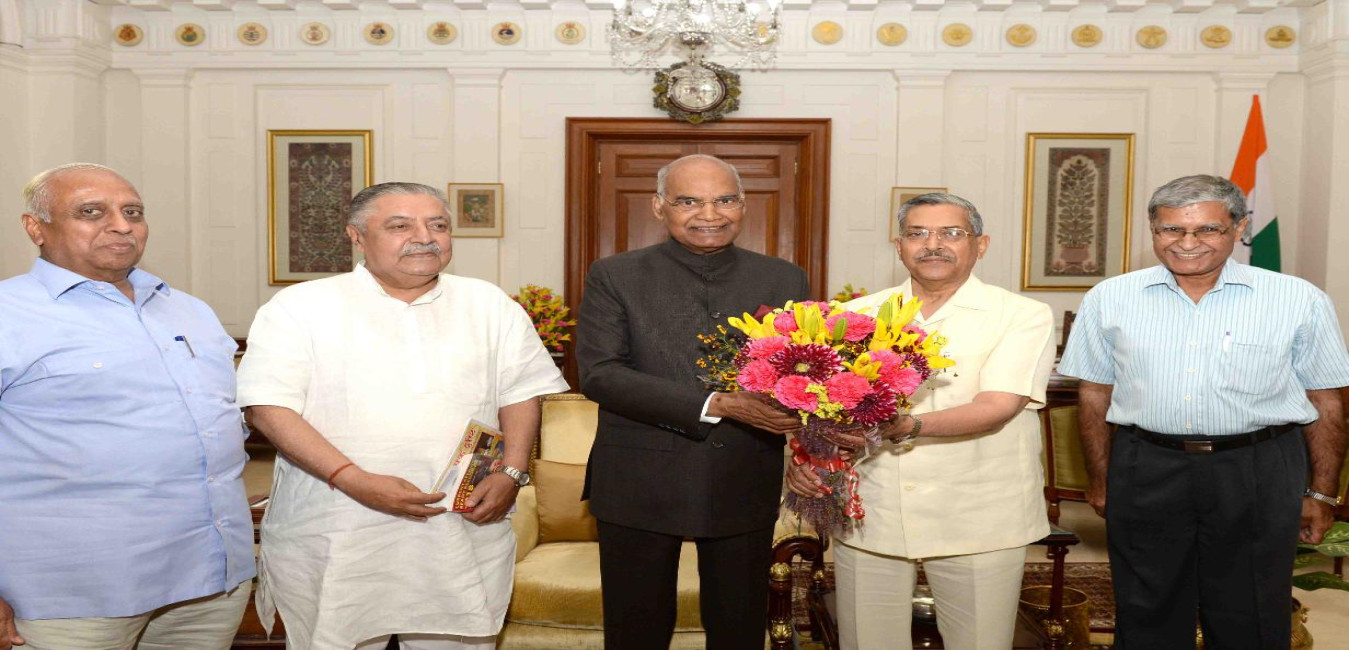 Shri Santosh Taneja along with Shri R.S. Gupta, President and Shri Ravi Bansal, Secretary, Sankalp and Shri Raj Kumar Bhatia meeting with the President of India, Shri Ram Nath Kovind, at Rashtrapati Bhavan on March 28, 2018.