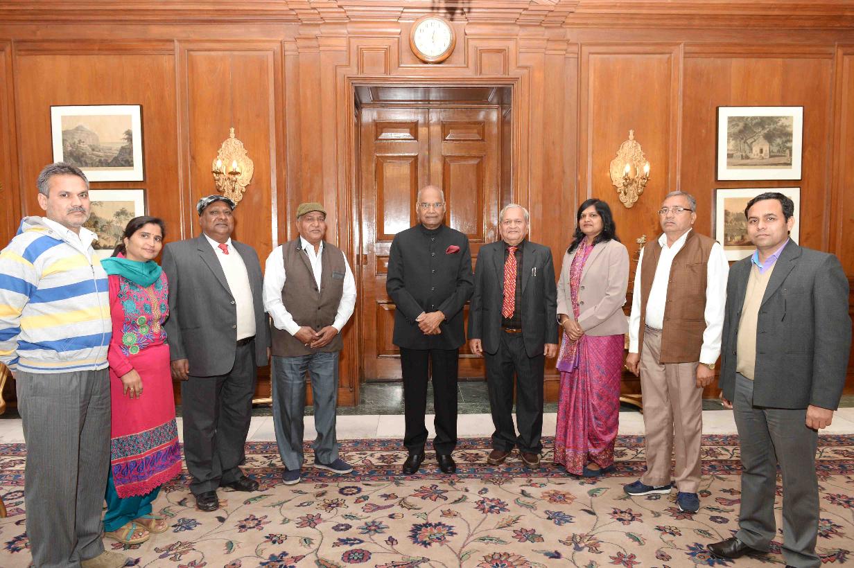 Shri M.L. Dipak, President Veerangana Jhalkar Bai Seva Sansthan, Ghaziabad along with Shri Ghanshyam Singh, Retd. DCM (Railways) and others meeting with the President of India, Shri Ram Nath Kovind, at Rashtrapati Bhavan on January 17, 2018.