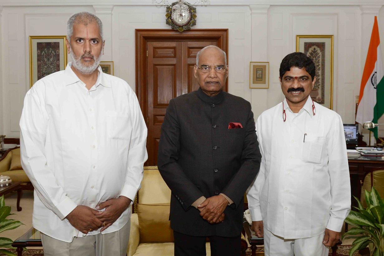Shri Pathuri Nagabhushanam, Ex-Chairman Zilla Parishad Guntur and Shri Ramineni Dharma Pracharak, Chairman, Dr. Ramineni Foundation meeting with the President of India, Shri Ram Nath Kovind, at Rashtrapati Bhavan on January 18, 2018.