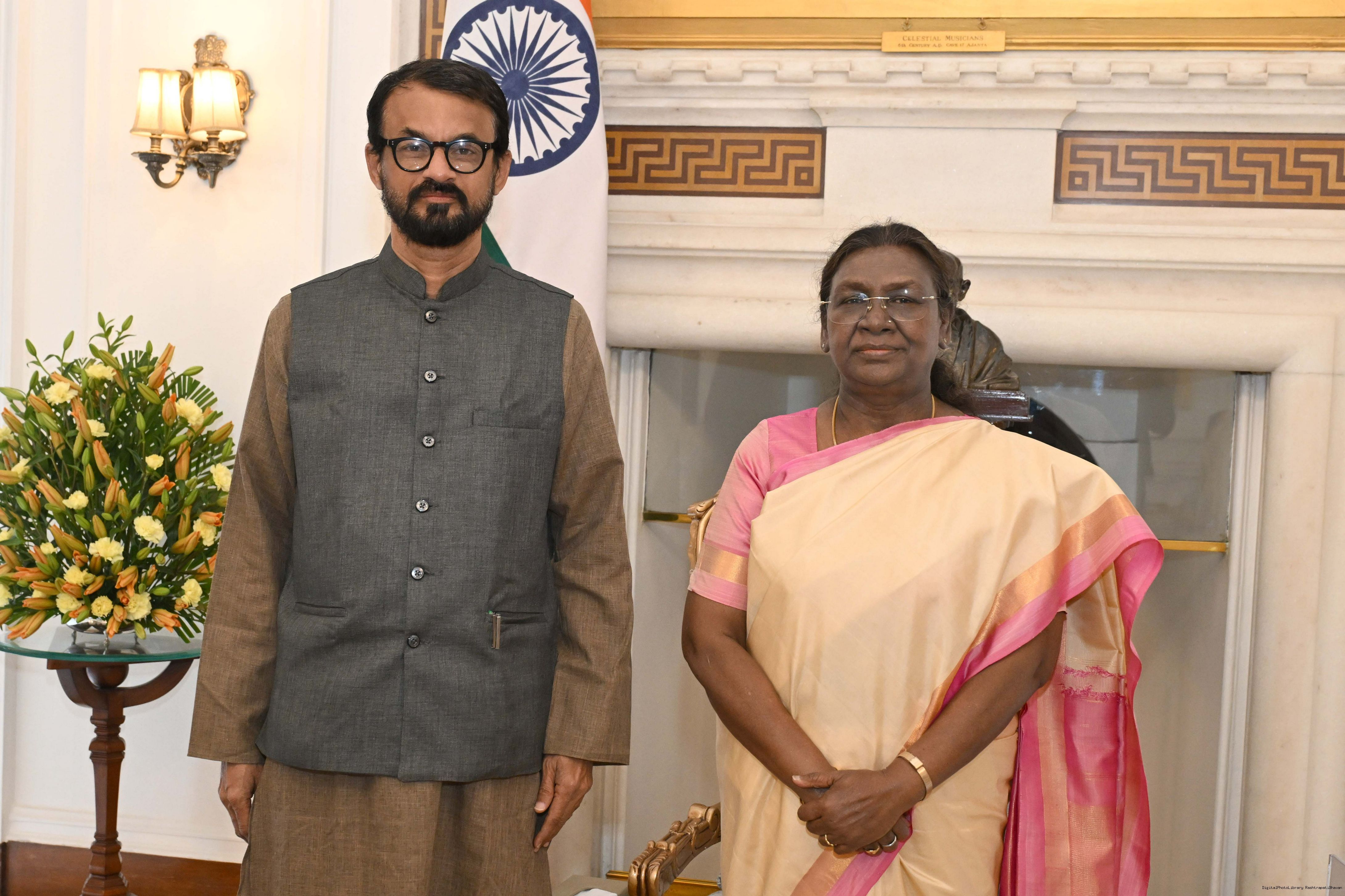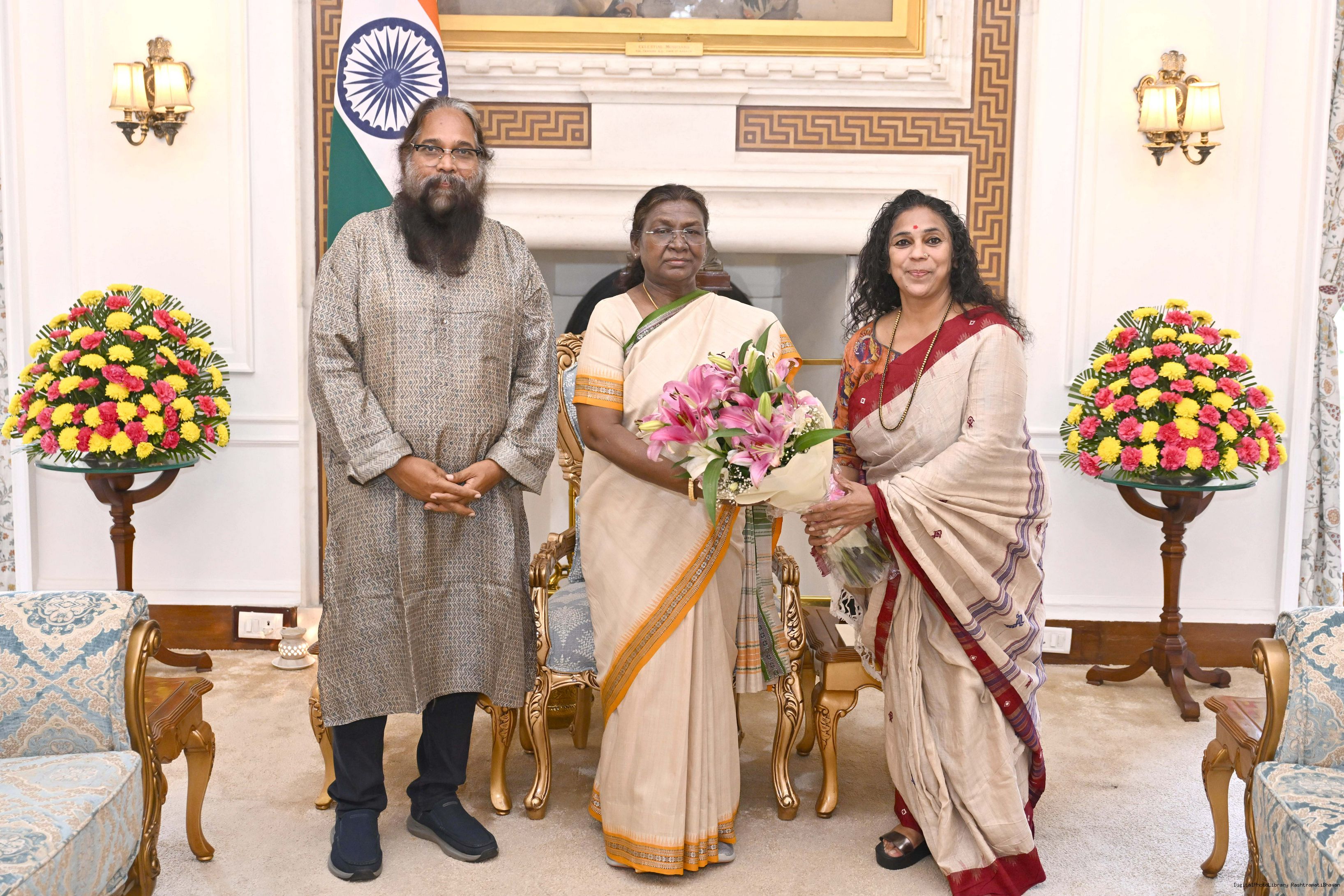 Shri Adwaita Gadanayak, Nominee for Padma Shri Award-2025 along with wife Smt. Nivedita Mishra meeting with the President of India Smt. Droupadi Murmu at Rashtrapati Bhavan on March 4, 2025.