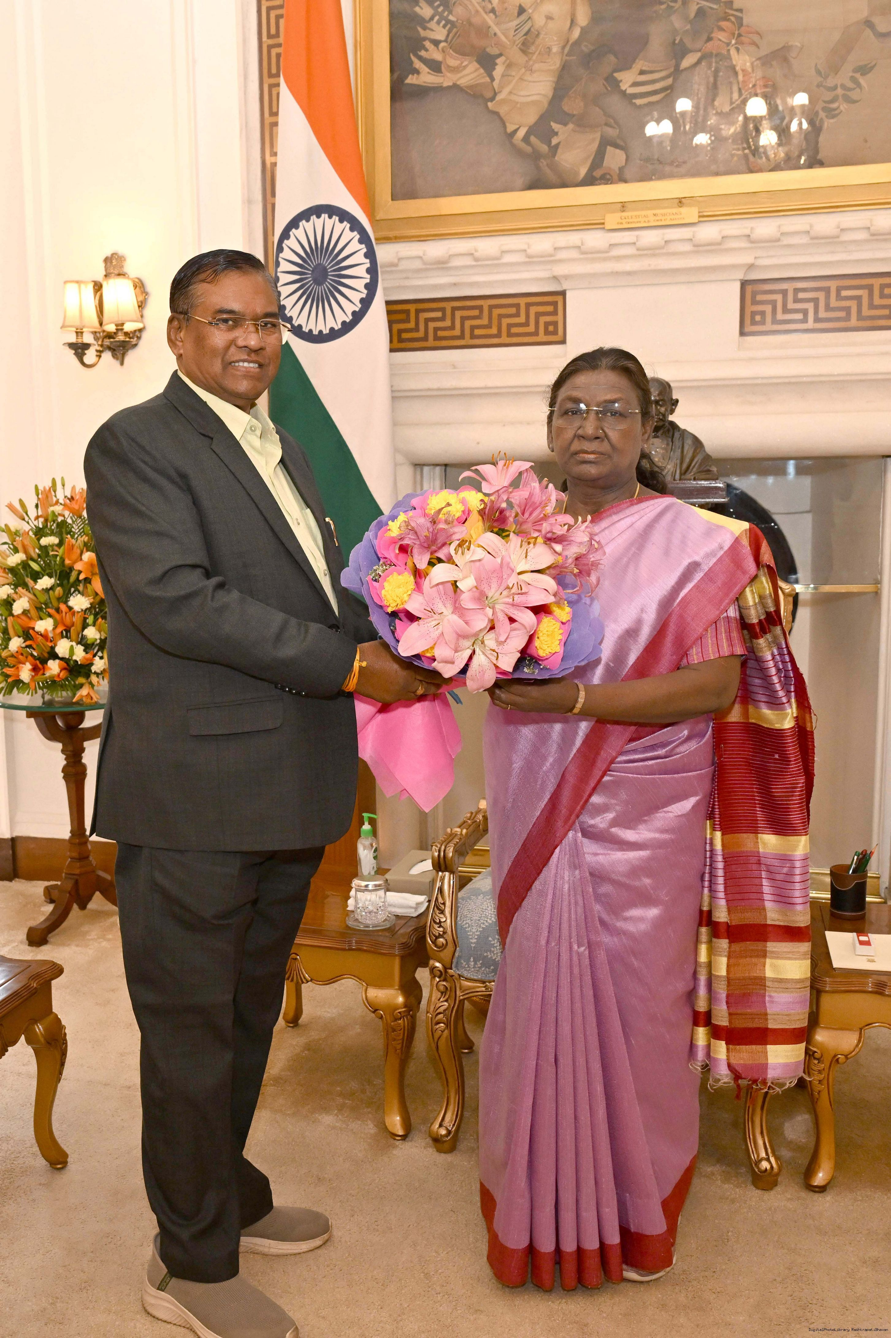 Shri Bibhuti Bhusan Nayak, President, The Institute of Cost Accountants of India, New Delhi meeting with the President of India, Smt. Droupadi Murmu at Rashtrapati Bhavan on March 26, 2025.