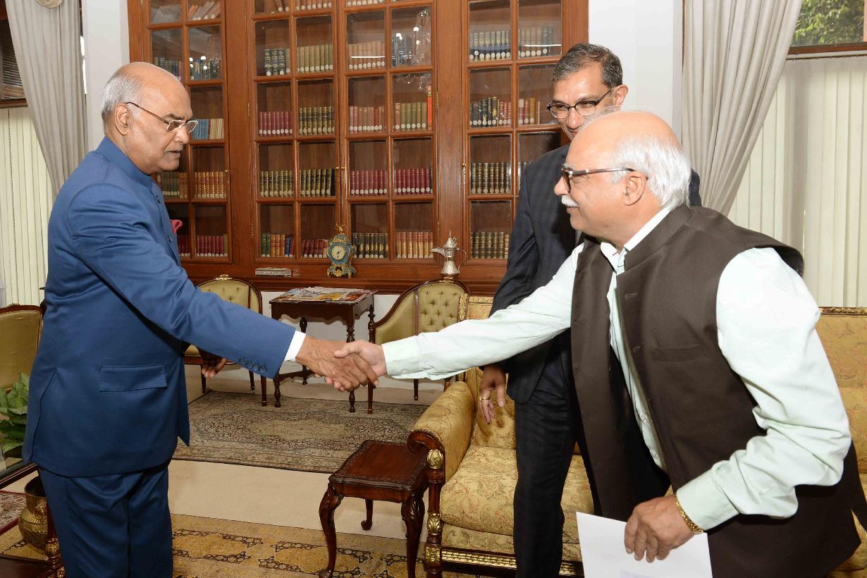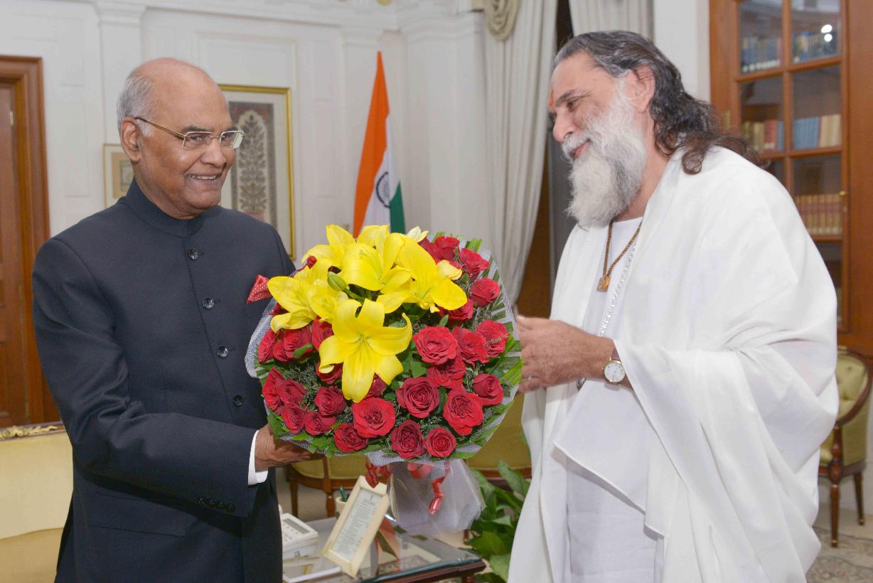 Swami Gyananand ji along with Shri Anand Mohan Sharan, Principal Secretary, Urban Local Bodies-cum-Principal Resident Commissioner, Govt. of Haryana and Smt. Sumedha Kataria, Deputy Commissioner, Kurukshetra meeting with the President of India, Shri Ram Nath Kovind, at Rashtrapati Bhavan on November 13, 2017.