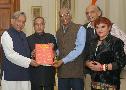 Shri Mani Shankar Aiyar, MP (RS) along with the Chairman of Institute of Social Sciences, Dr George Mathew presenting the Book Status of Panchayati Raj in the States & Union Territories of India 2013 to the President of India, Shri Pranab Mukherjee at Rashtrapati Bhavan in New Delhi on Nov 06, 2013