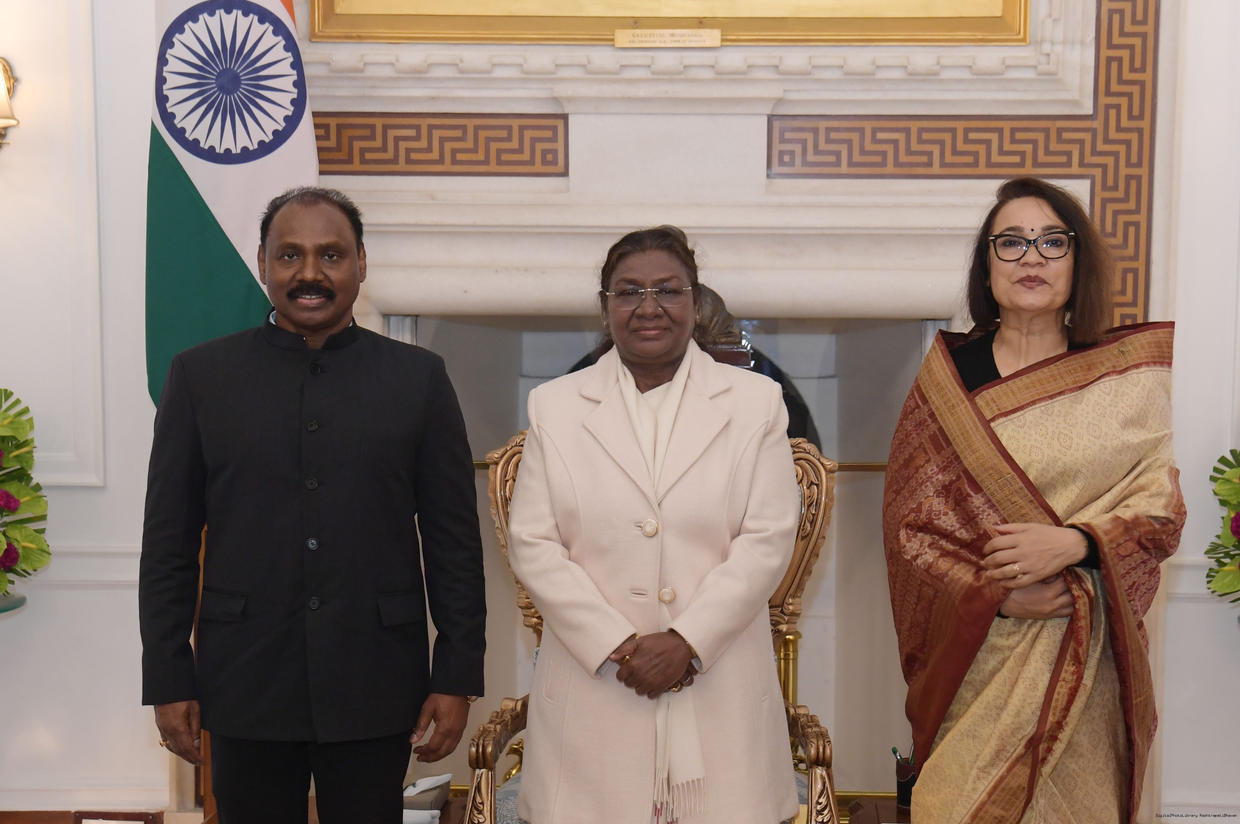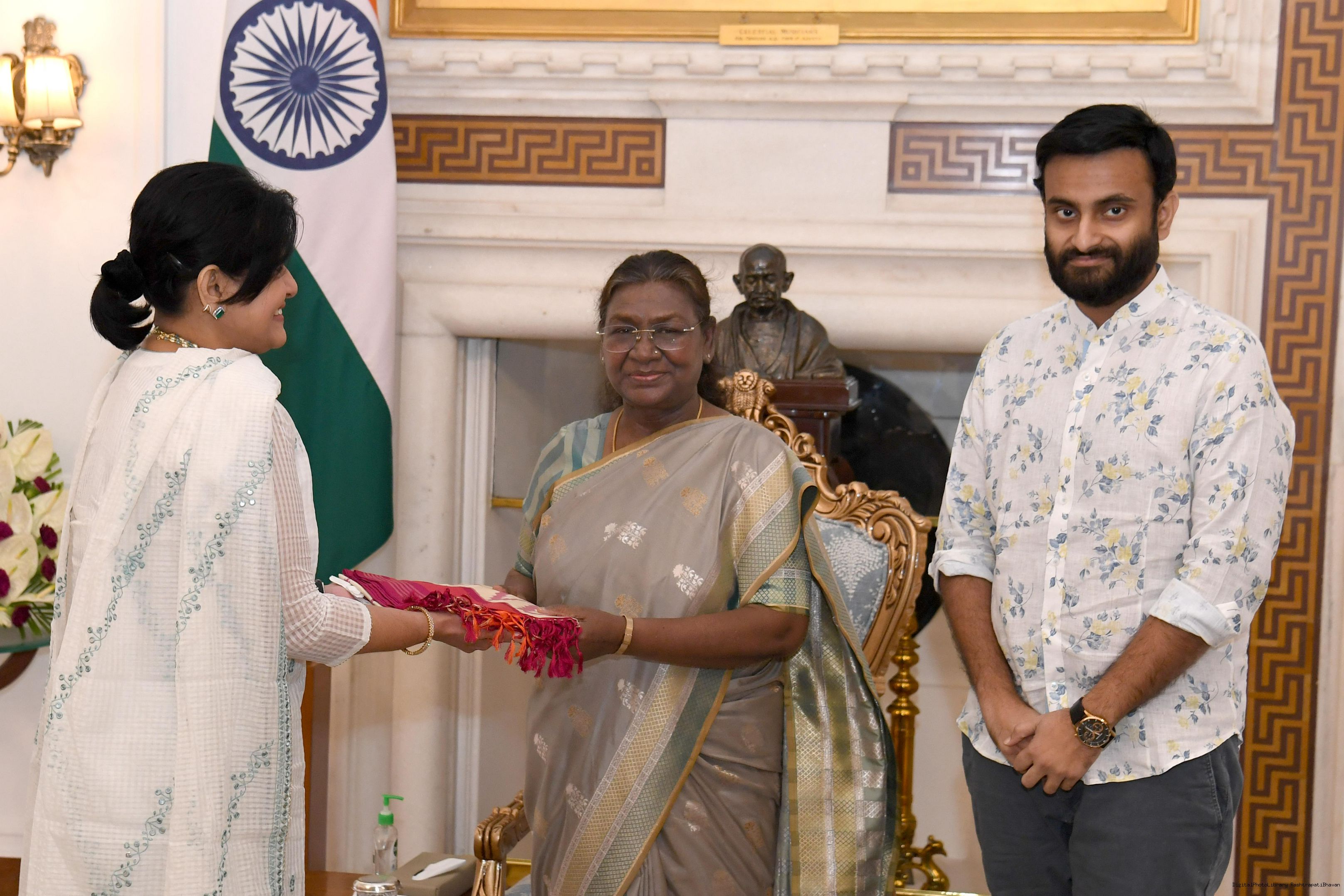 Smt. Deepa Venkat Immani, daughter of former Vice-President of India Shri M. Venkaiah Naidu along with others meeting with the President of India Smt. Droupadi Murmu at Rashtrapati Bhavan on January 7, 2025.