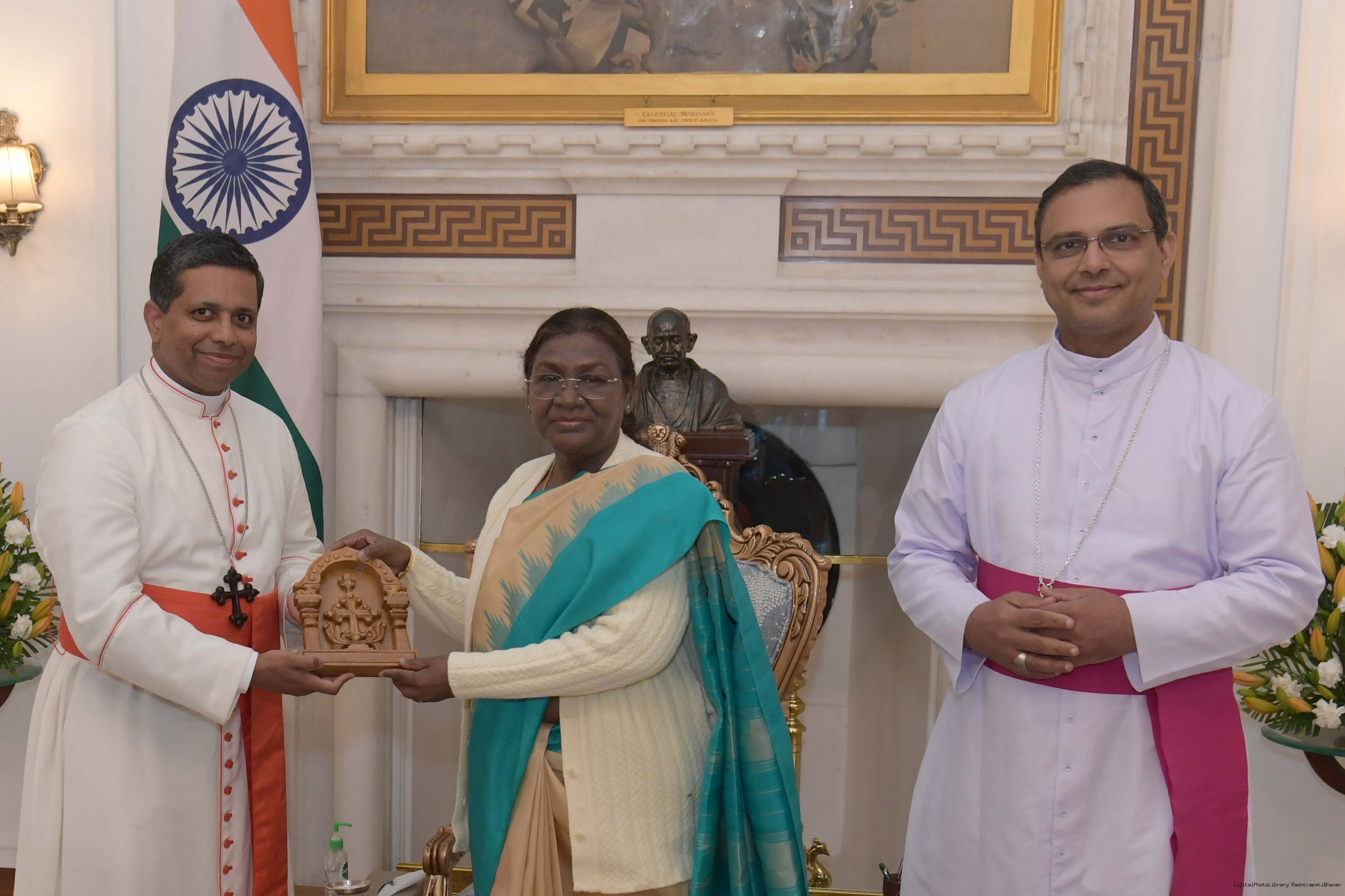 Shri George Kurian, MoS for Minority Affairs and Fisheries, Animal Husbandry and Dairying, Govt of India along with others meeting with the President of India Smt. Droupadi Murmu at Rashtrapati Bhavan on December 23, 2024.
