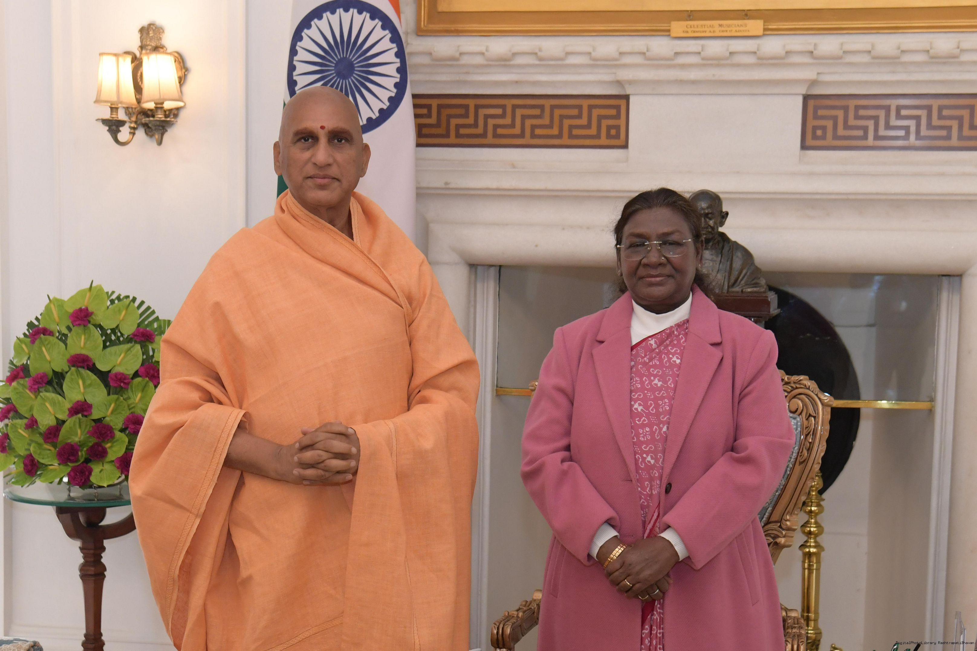 Swami Avdheshanand Giri ji, Chief of Panchdashnam Juna Akhara meeting with the President of India Smt. Droupadi Murmu at Rashtrapati Bhavan on December 24, 2024.