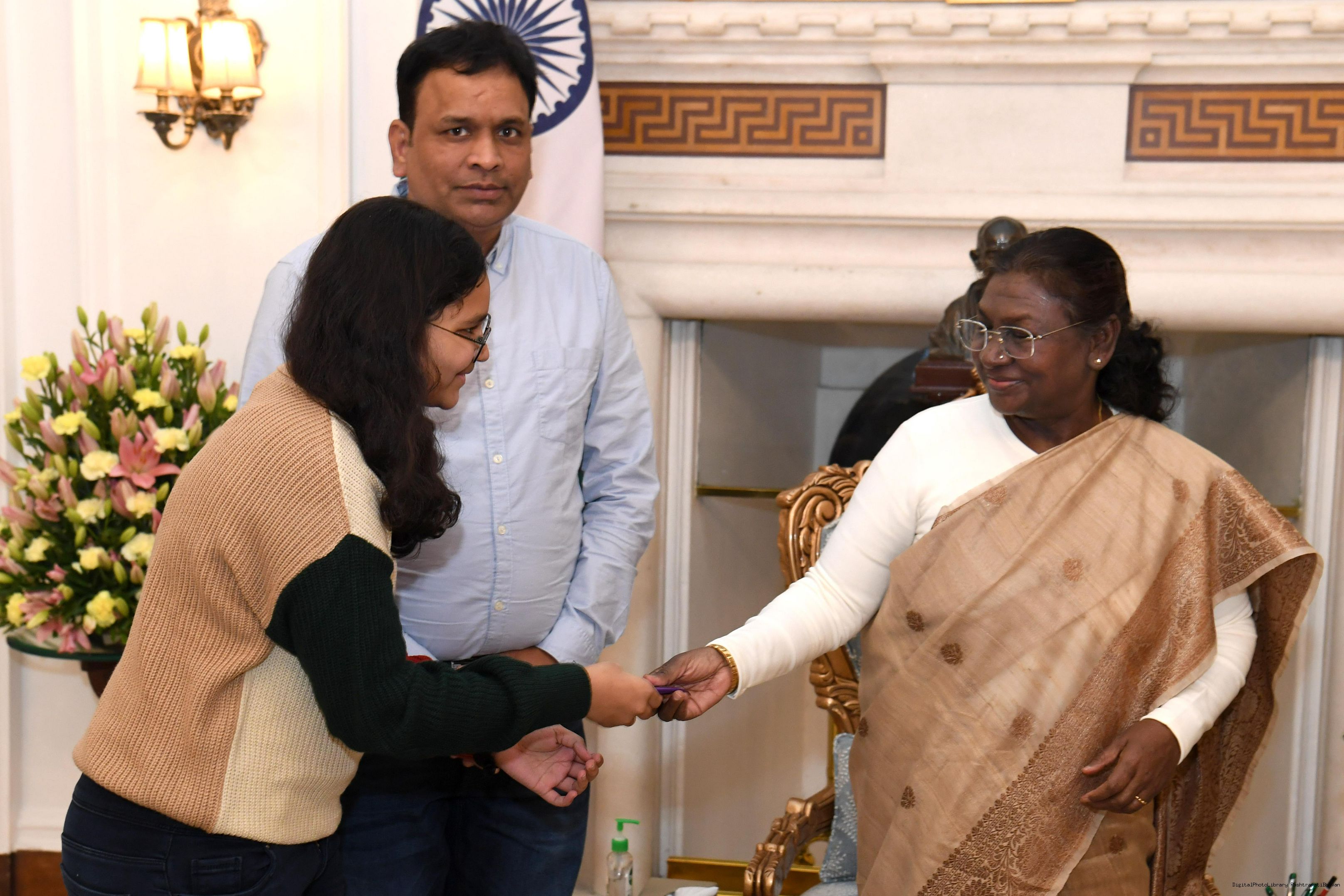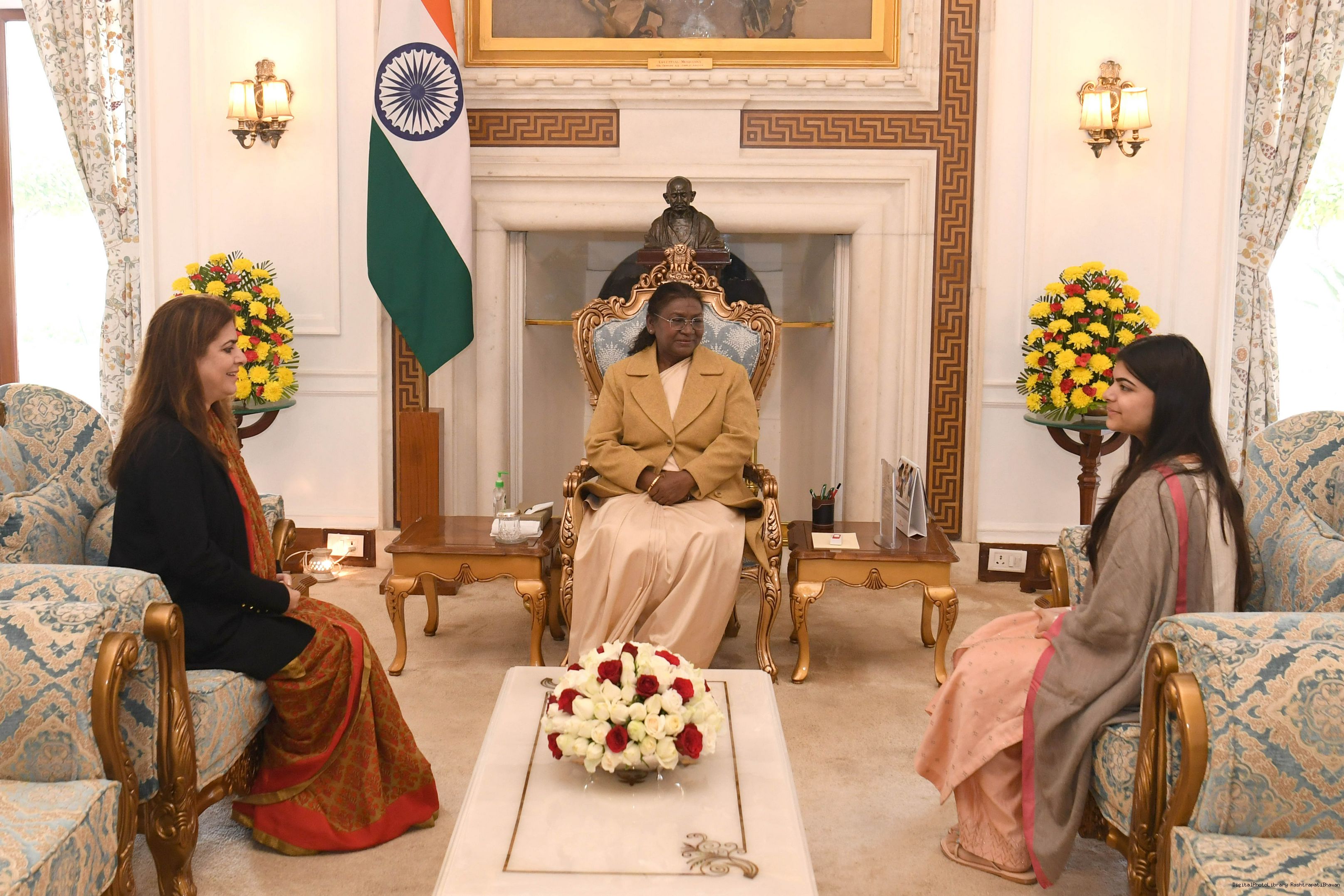 Smt. Sonia Singh, Editorial Director, Anchor, NDTV Dialogues along with daughter Ms. Suhaani Rajyalakshmi Singh meeting with the President of India Smt. Droupadi Murmu at Rashtrapati Bhavan on December 26, 2024.
