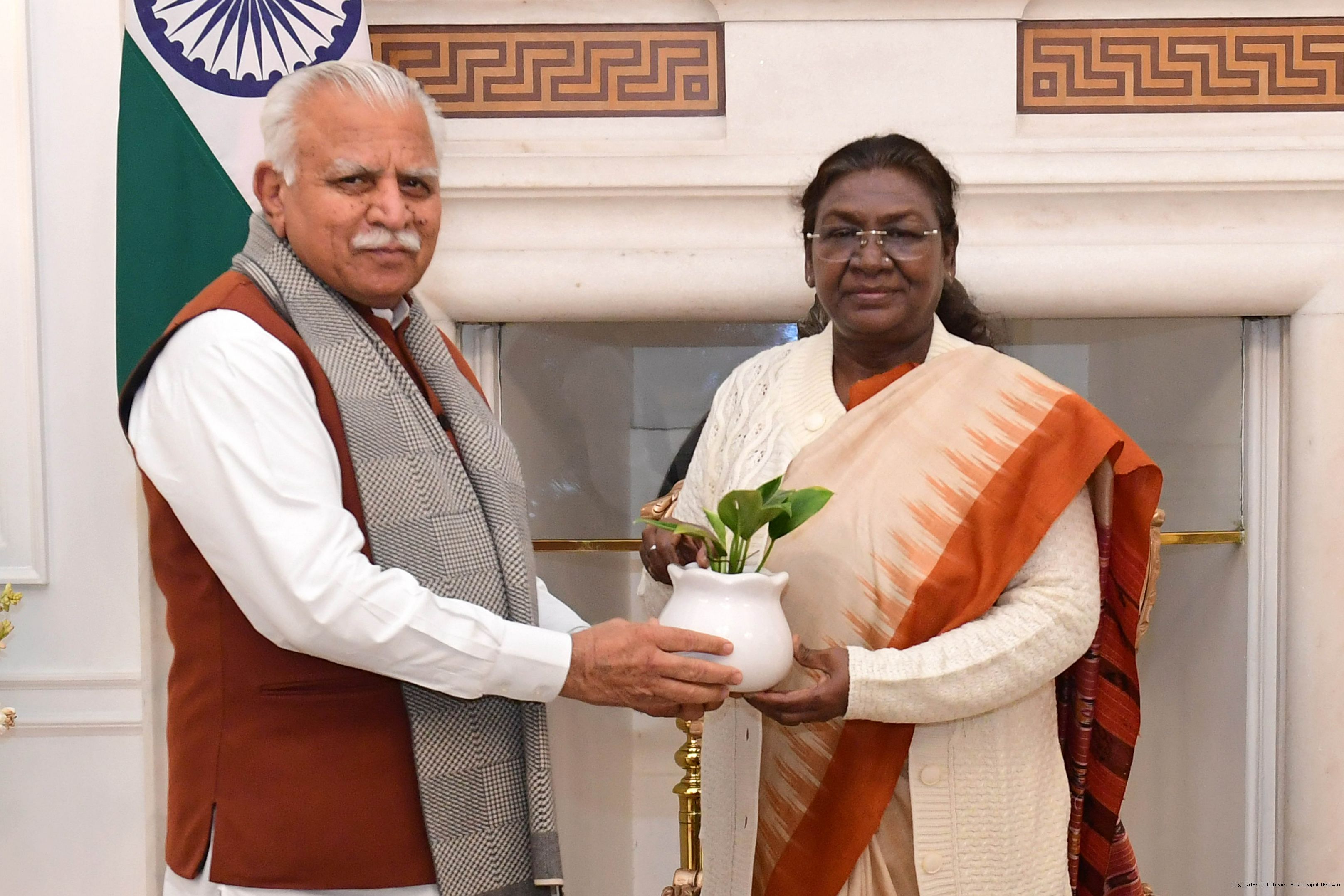 Shri Manohar Lal Khattar, Union Minister of Housing and Urban Affairs and Minister of Power meeting with the President of India Smt. Droupadi Murmu at Rashtrapati Bhavan on December 28, 2024.