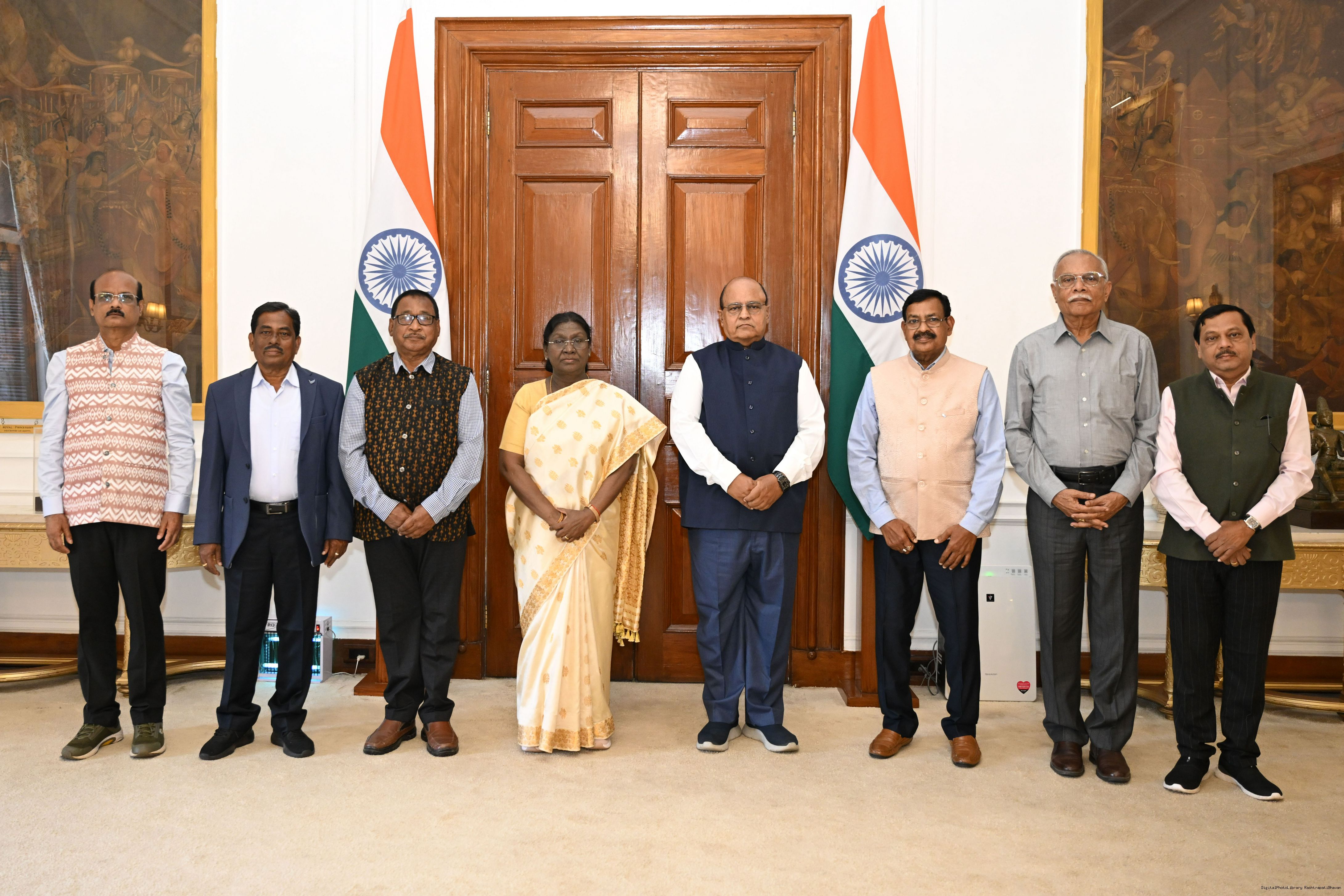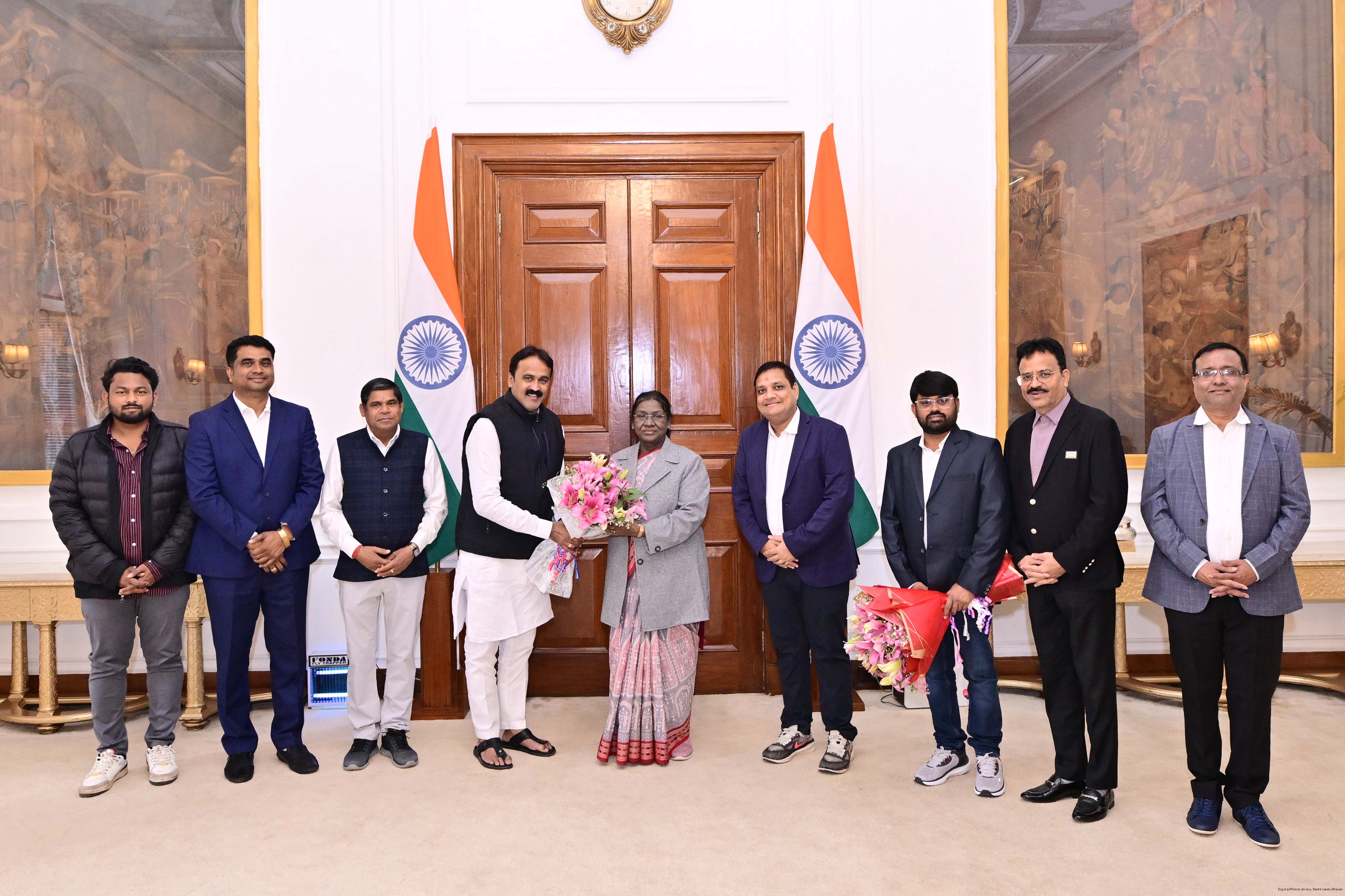 Shri Bikash Chandra Mohanta from Rairangpur along with others meeting with the President of India Smt. Droupadi Murmu at Rashtrapati Bhavan on March 5, 2026.