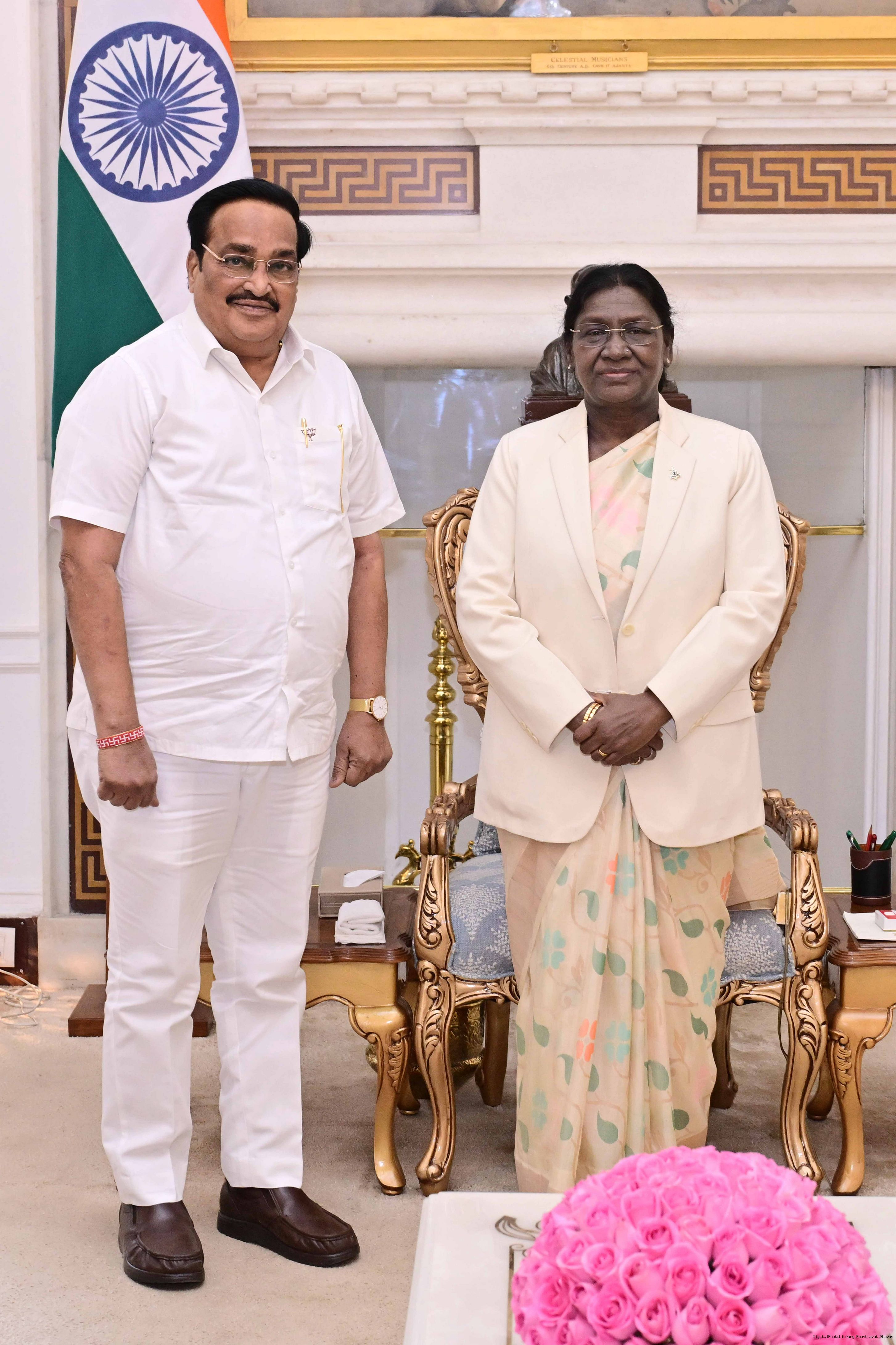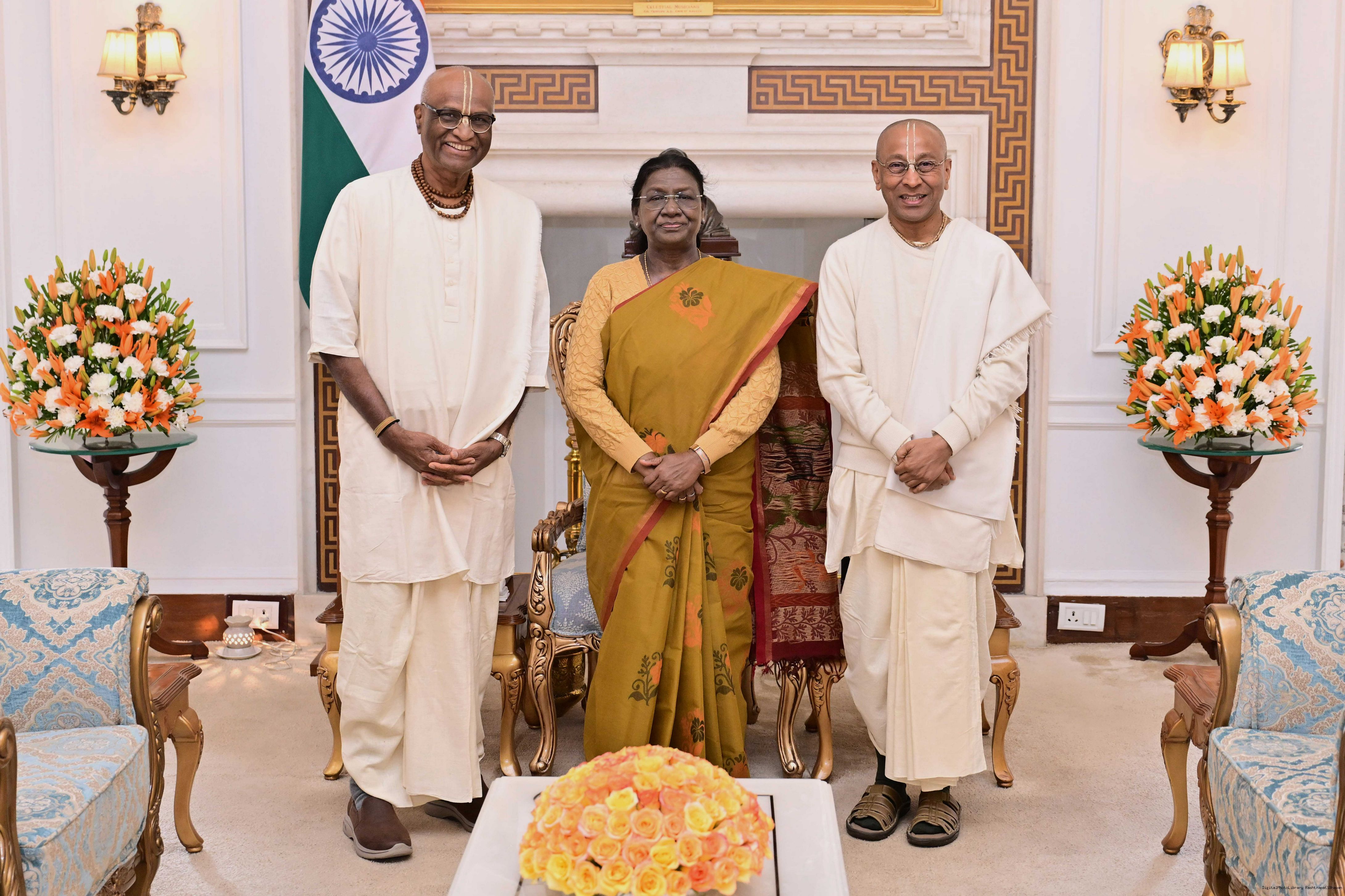 Shri Madhu Pandit Dasa, Founder Chairperson, The Akshaya Patra Foundation and Shri Chanchalapathi Das, Vice Chairman and Co-Founder meeting with the President of India, Smt Droupadi Murmu at Rashtrapati Bhavan on January 22, 2026.