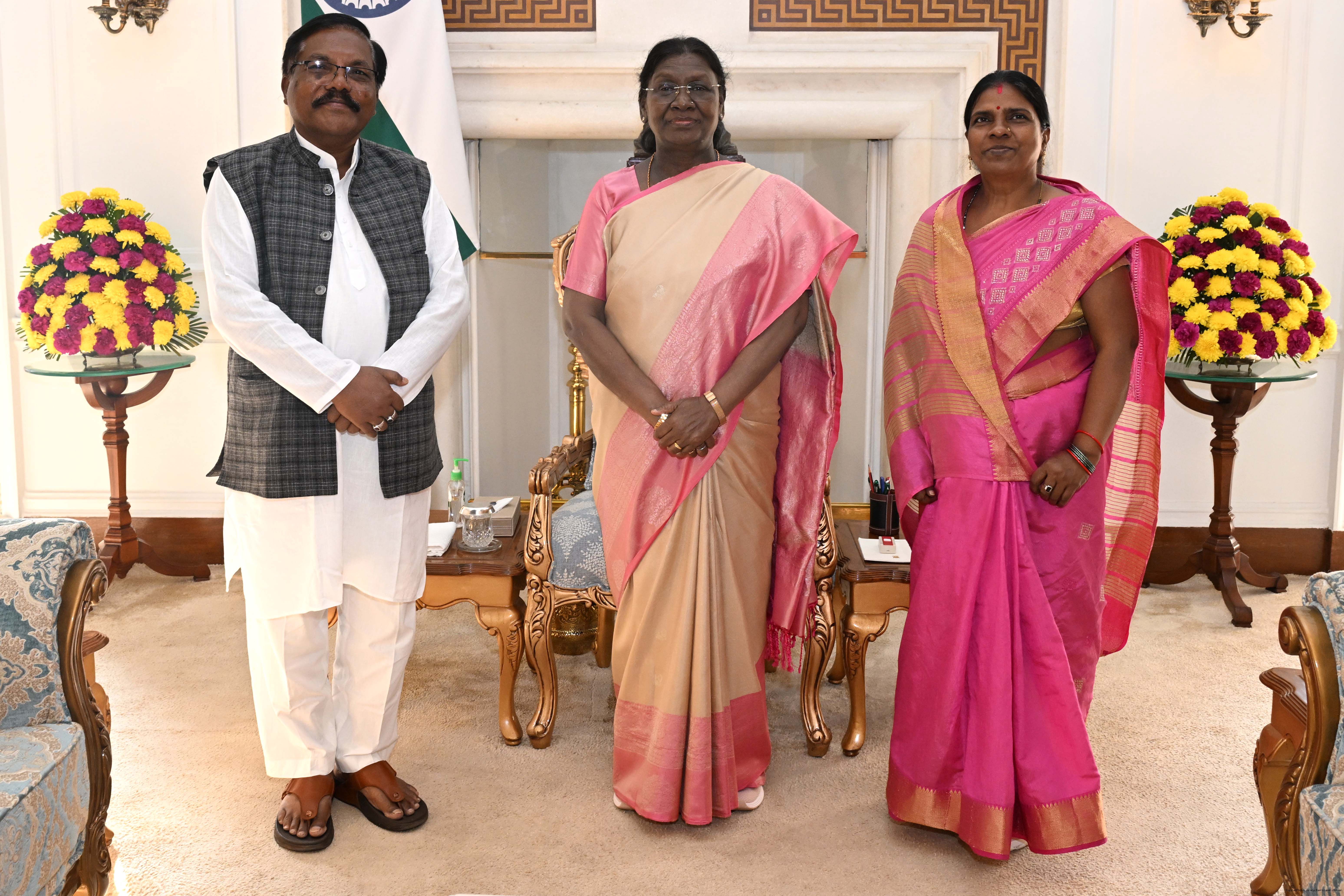 Shri Parsuram Majhi, former MP along with spouse Smt. Kusum Majhi meeting with the President of India, Smt Droupadi Murmu at Rashtrapati Bhavan on February 20, 2026.