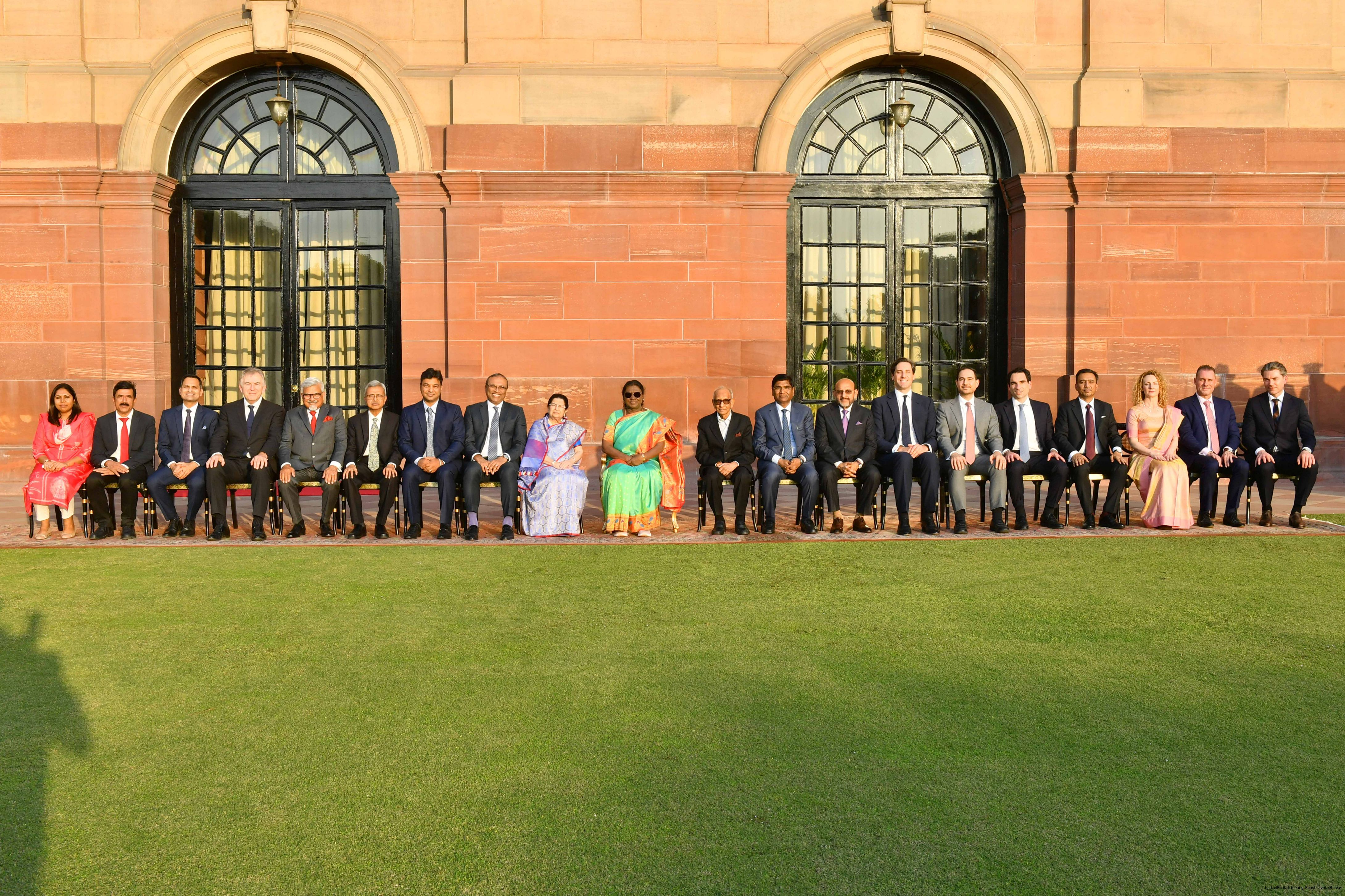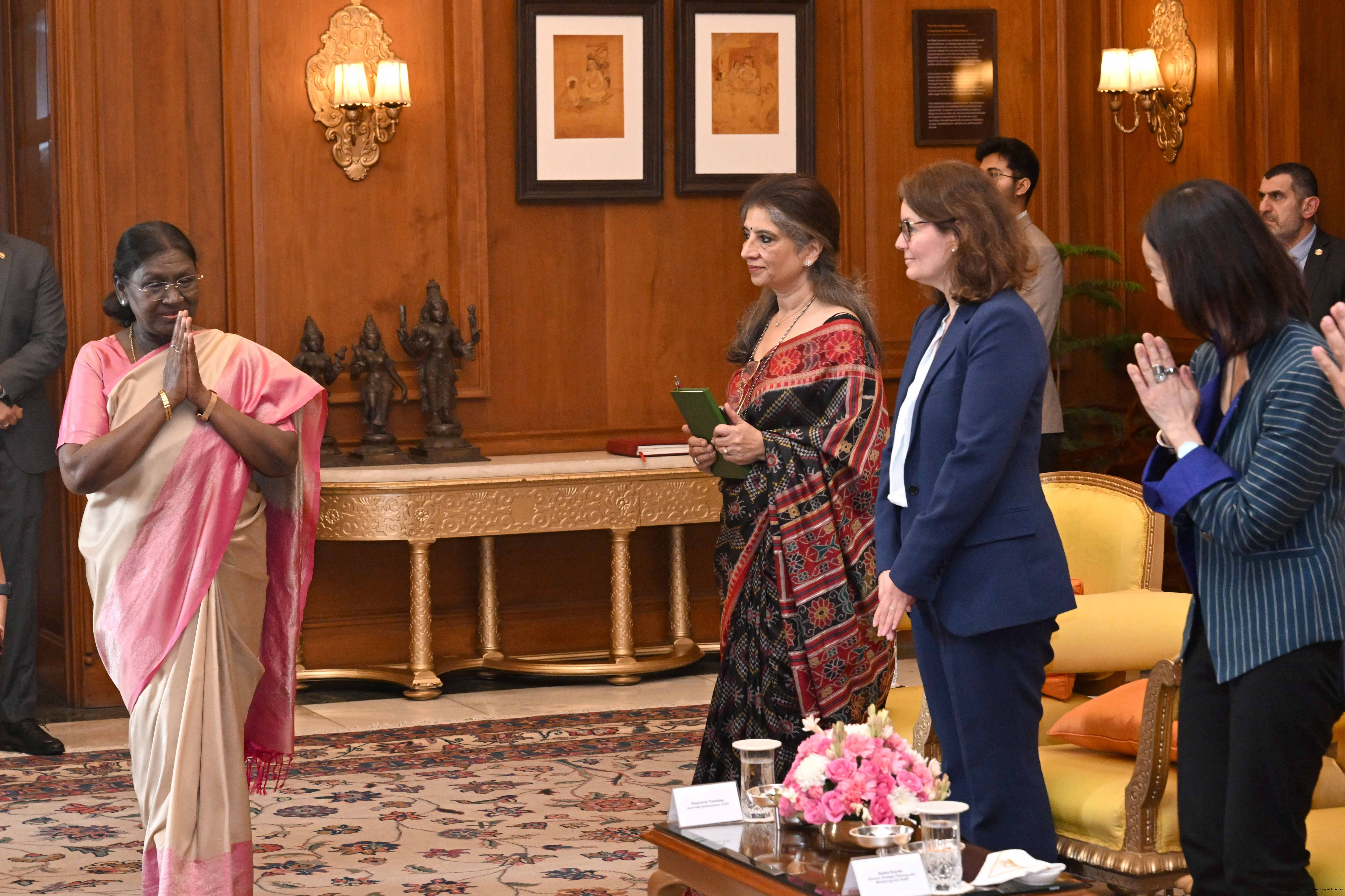 Smt. Rajshree Birla along with Shri Askaran Agarwala along with others meetig with the President of India, Smt Droupadi Murmu at Rashtrapati Bhavan on February 23, 2026.