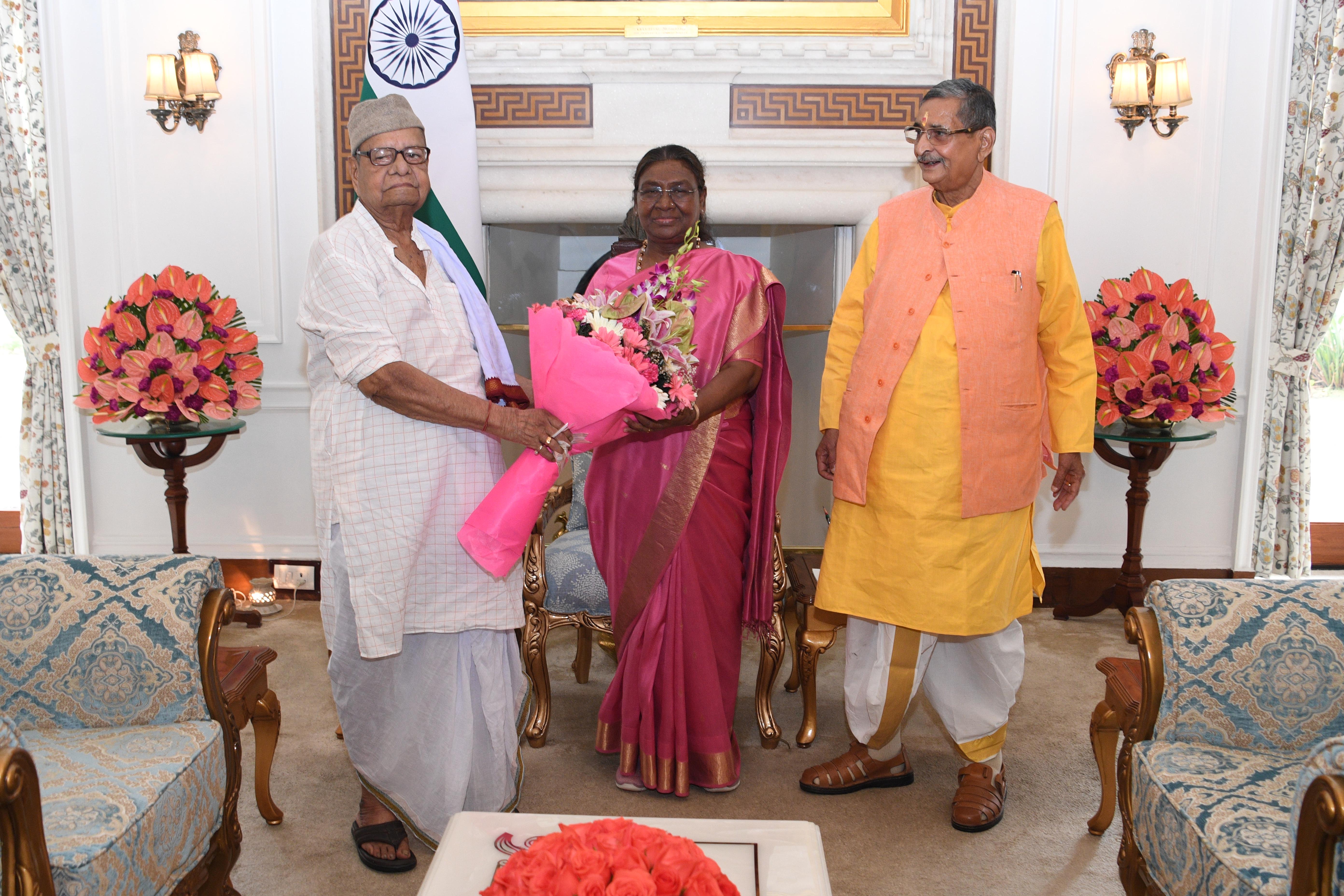 Shri Devdas Apte, Former Member of Parliament (RS) along with R.K. Sinha, Former Member of Parliament (RS) meeting with the President of India, Smt Droupadi Murmu at Rashtrapati Bhavan on July 1, 2024.