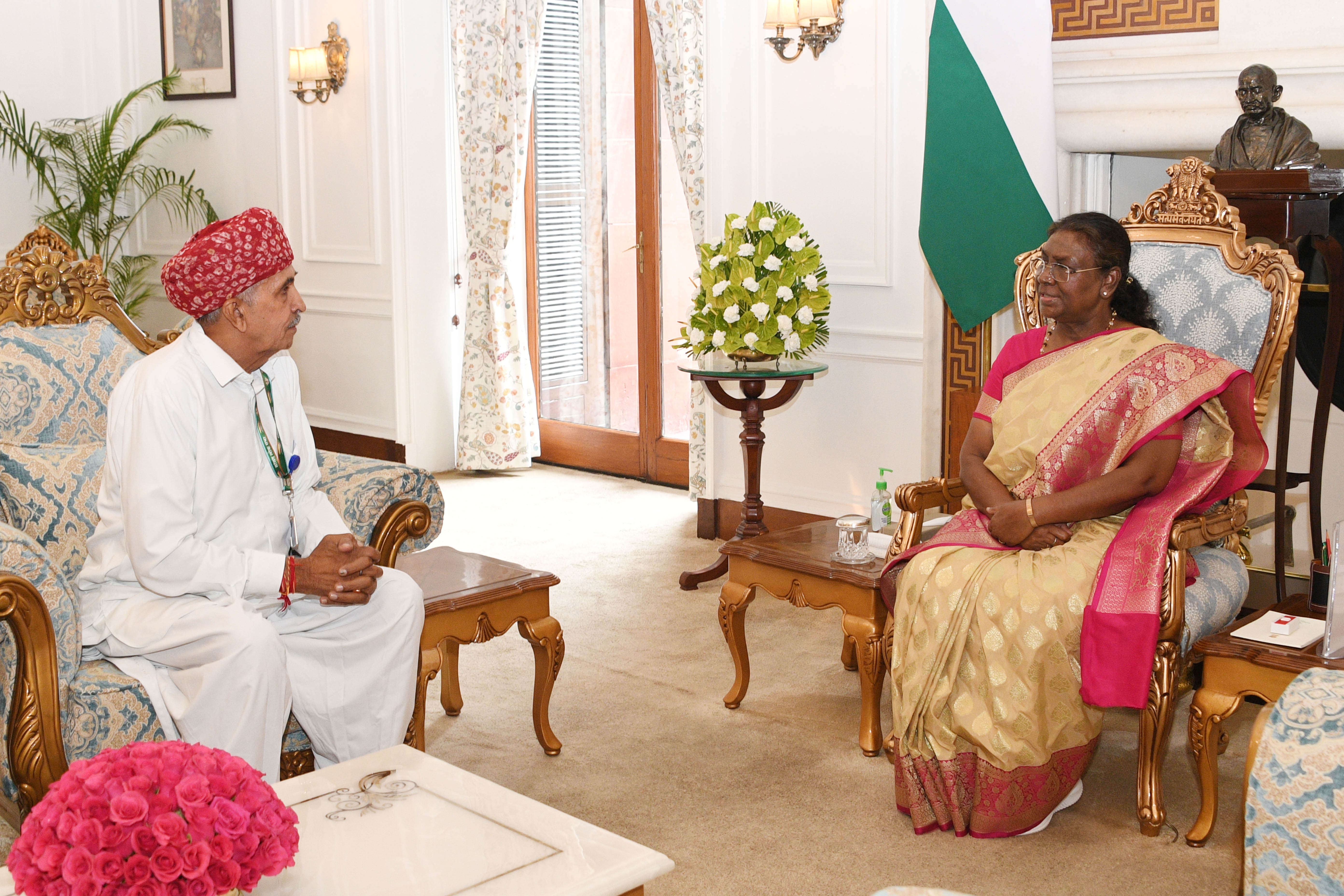 Shri Lumba Ram, MP (Lok Sabha) from Jalore, Rajasthan meeting with the President of India Smt. Droupadi Murmu at Rashtrapati Bhavan on July 3, 2024.