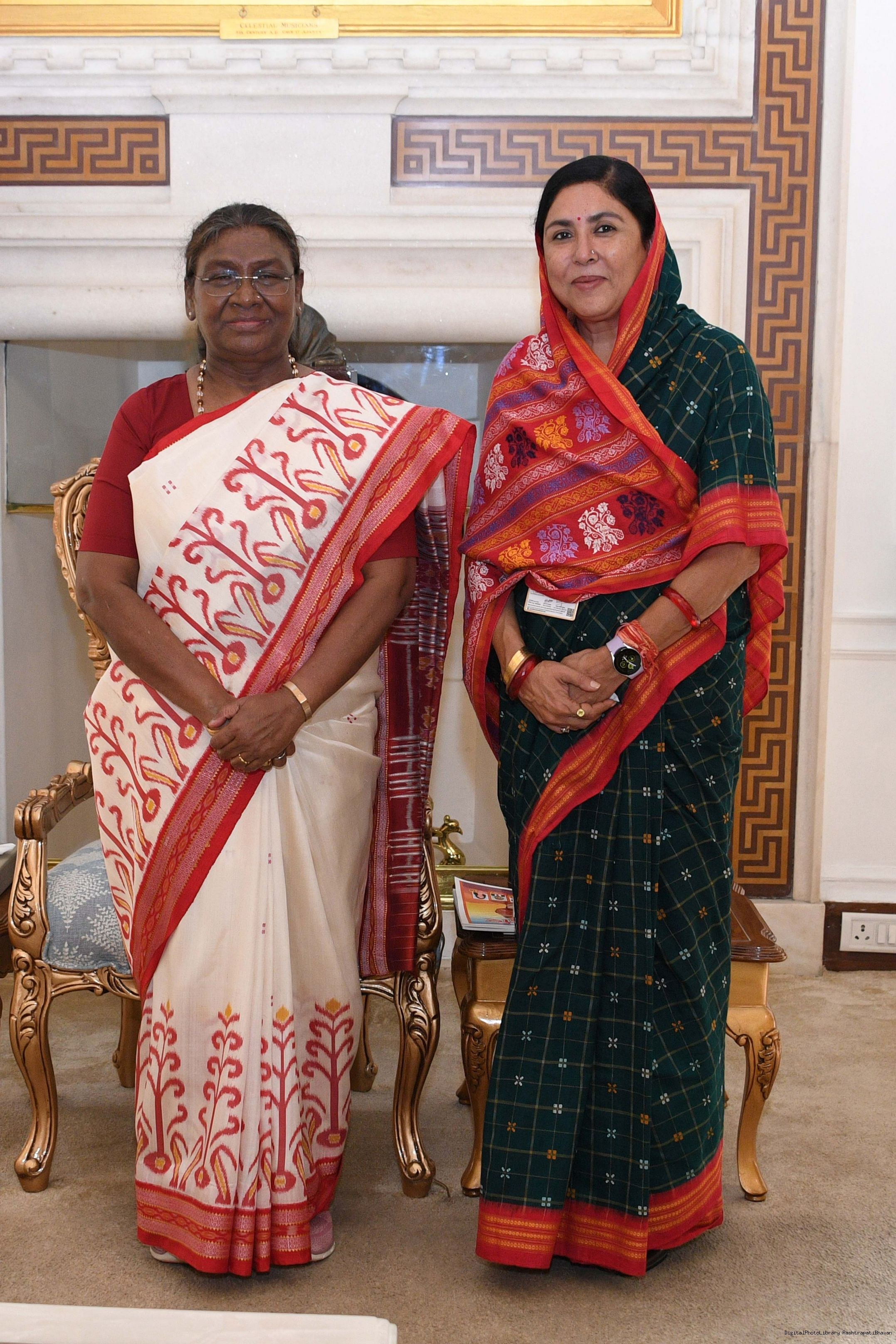 Smt Pratibha Roy (Padma Bhushan Gyanpeeth Awardee) along with others meeting with the President of India, Smt Droupadi Murmu at Rashtrapati Bhavan on July 1, 2024.