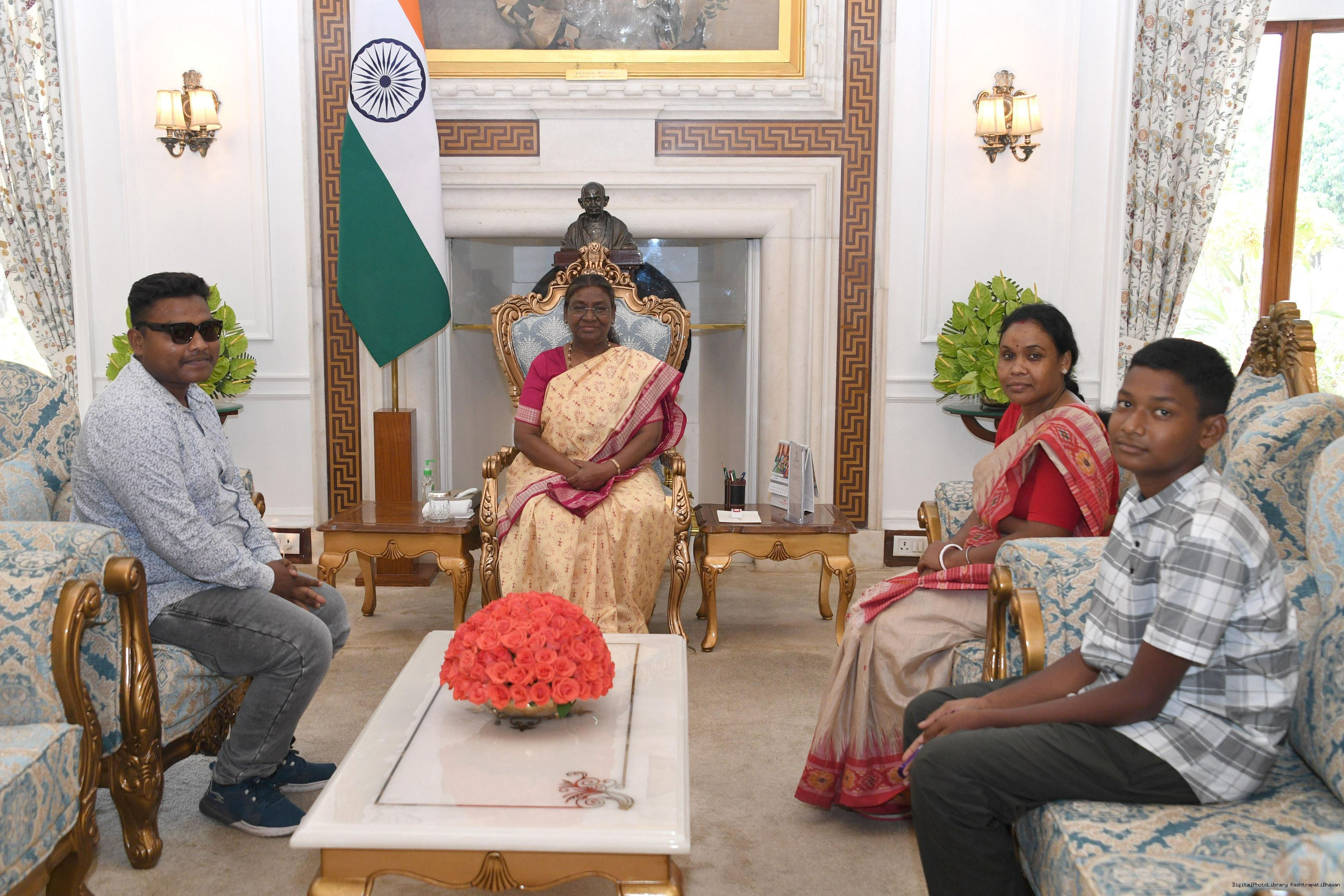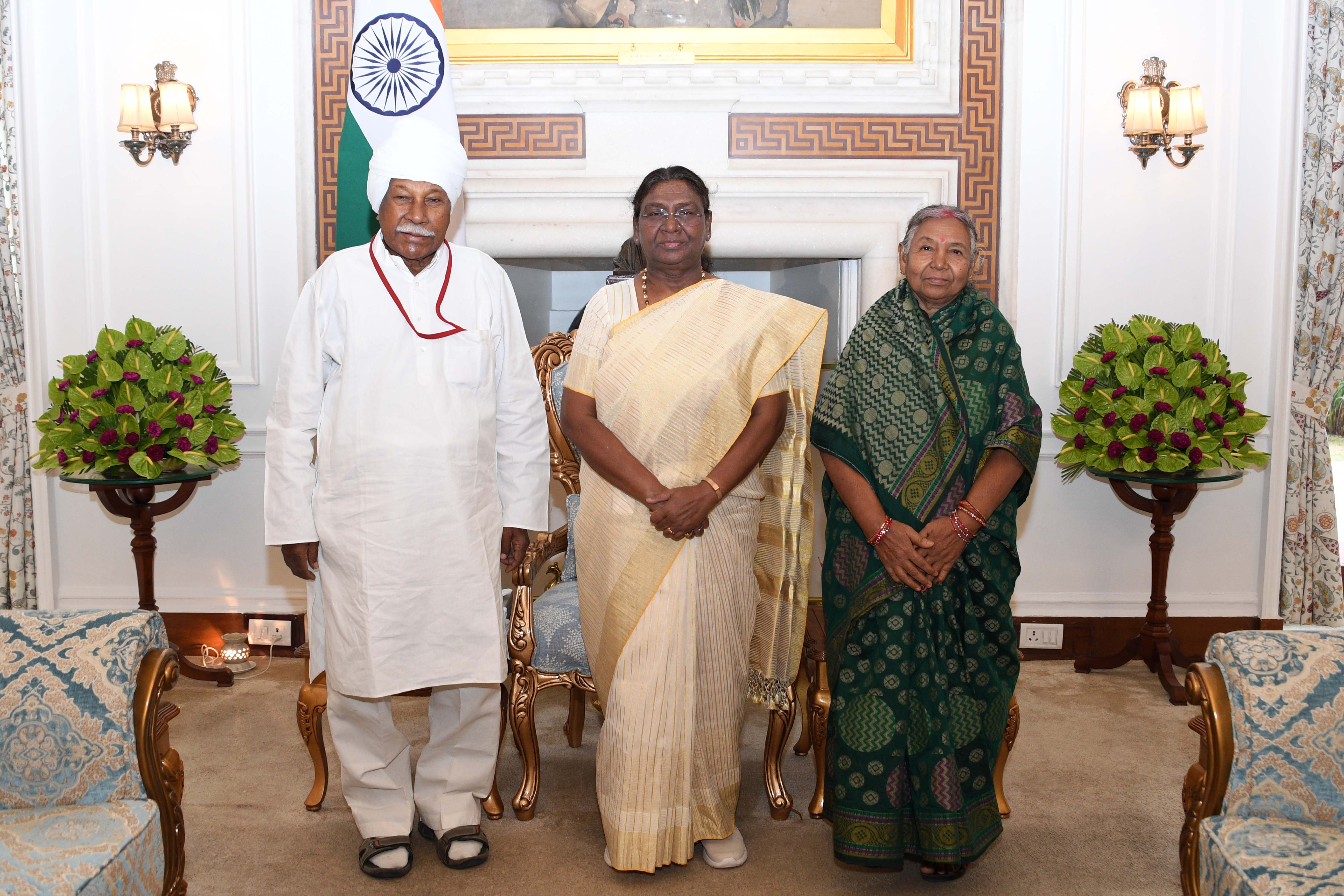 Shri Satish Chandra Pratihari of Badampahar along with others meeting with the president of India Smt Droupadi Murmu at Rashatrapati Bhawan on June 20, 2024.