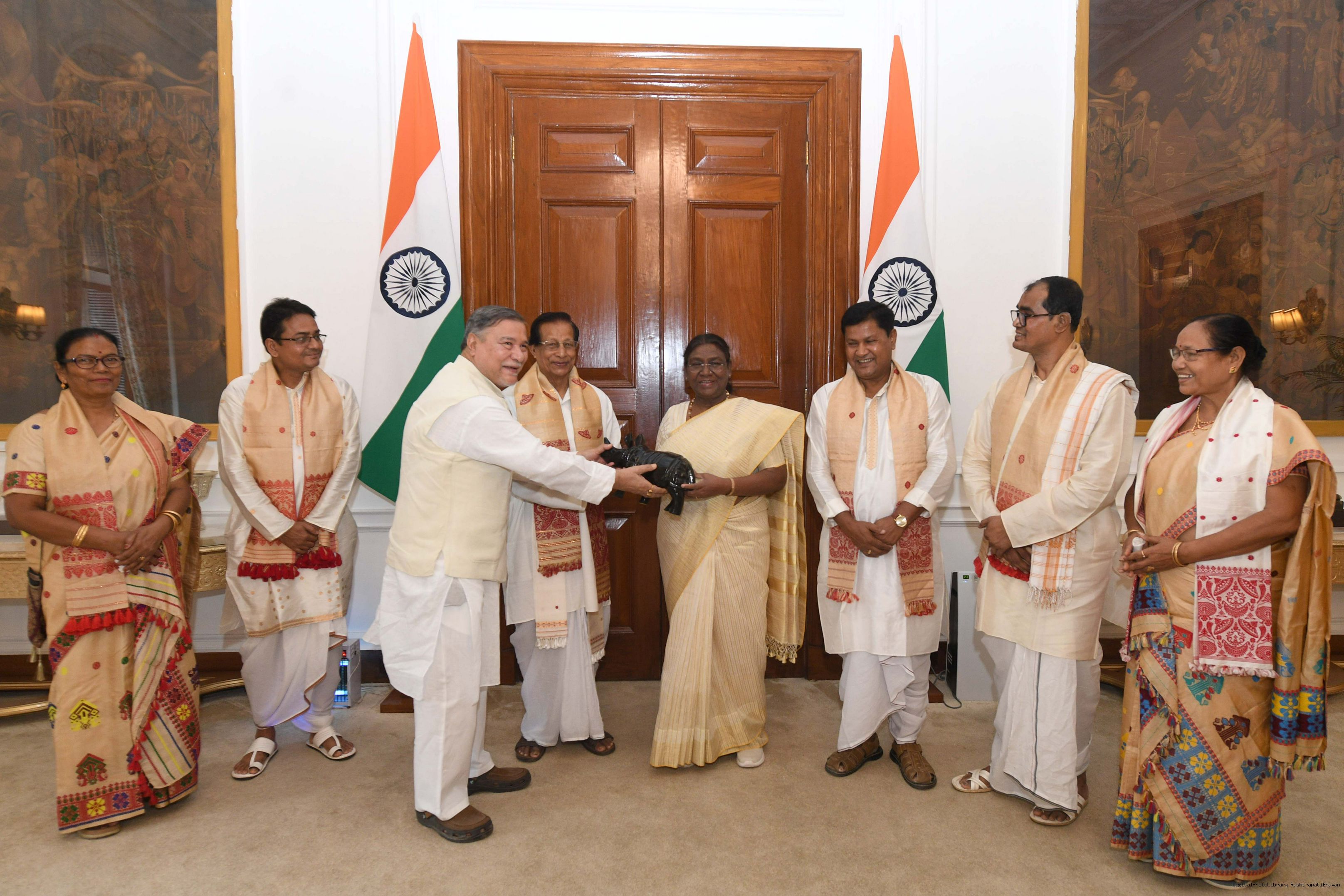 Shri Bhubaneswar Kalita, MP (Rajya Sabha) along with others meeting with the President of India Smt. Droupadi Murmu at Rashtrapati Bhavan on Jun 26, 2024.