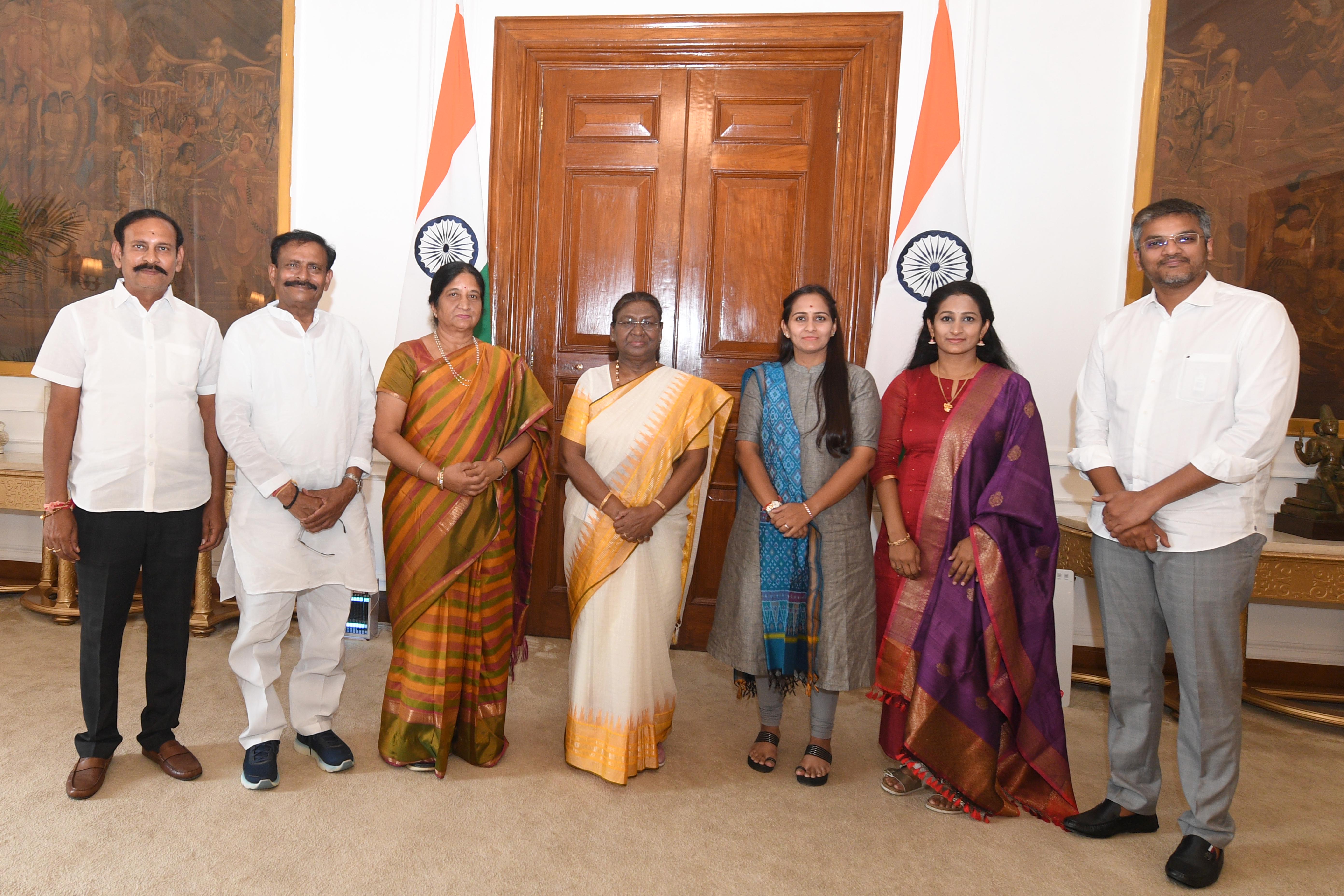 Shri V. Vijaya Raghava Reddy from Rairangpur along with others meeting with the President of India, Smt. Droupadi Murmu at Rashtrapati Bhavan on July 01, 2024.