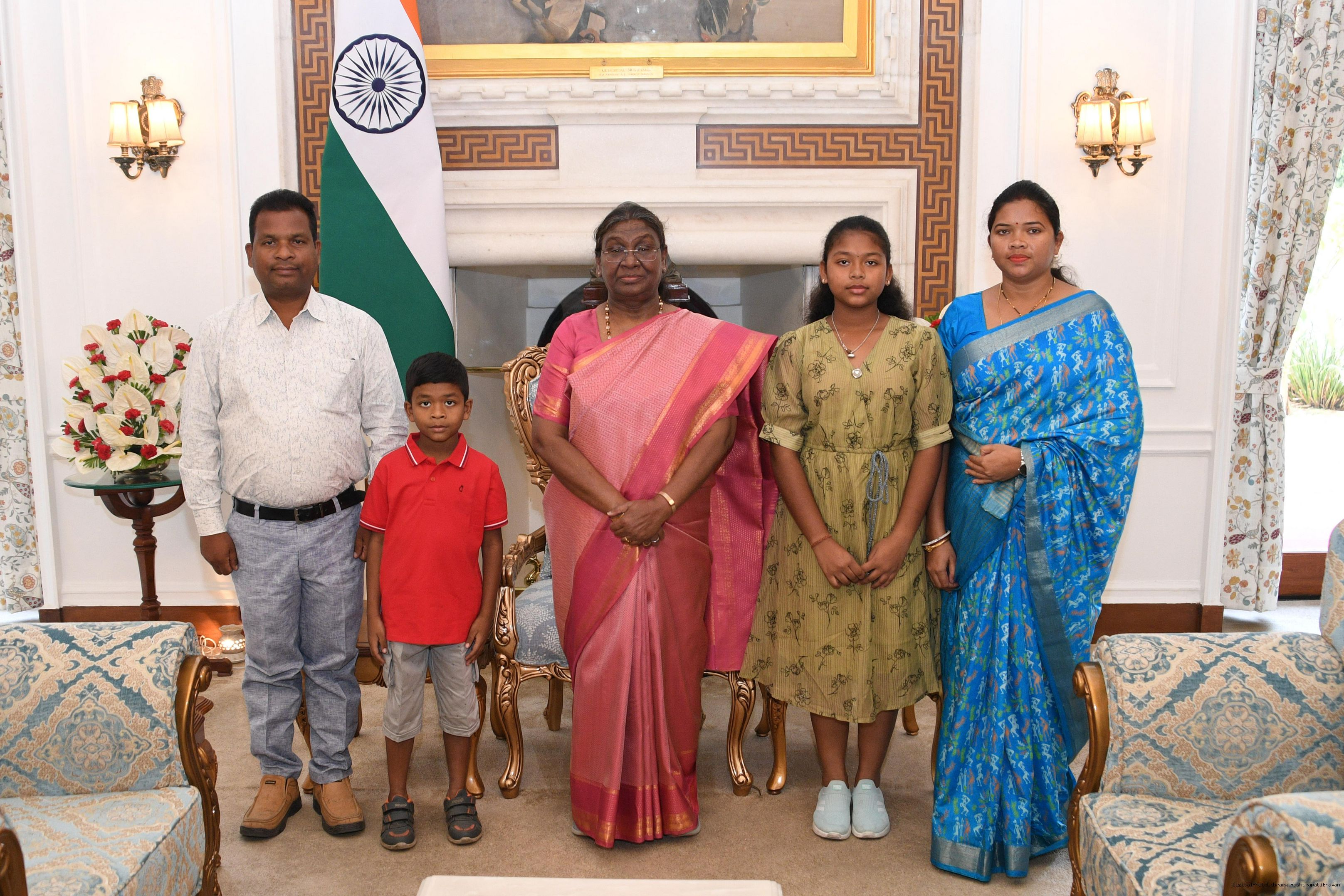 Shri Dasmat Murmu from Rairangpur along with others meeting with the president of India Smt Droupadi Murmu at Rashatrapati Bhawan on June 13, 2024.