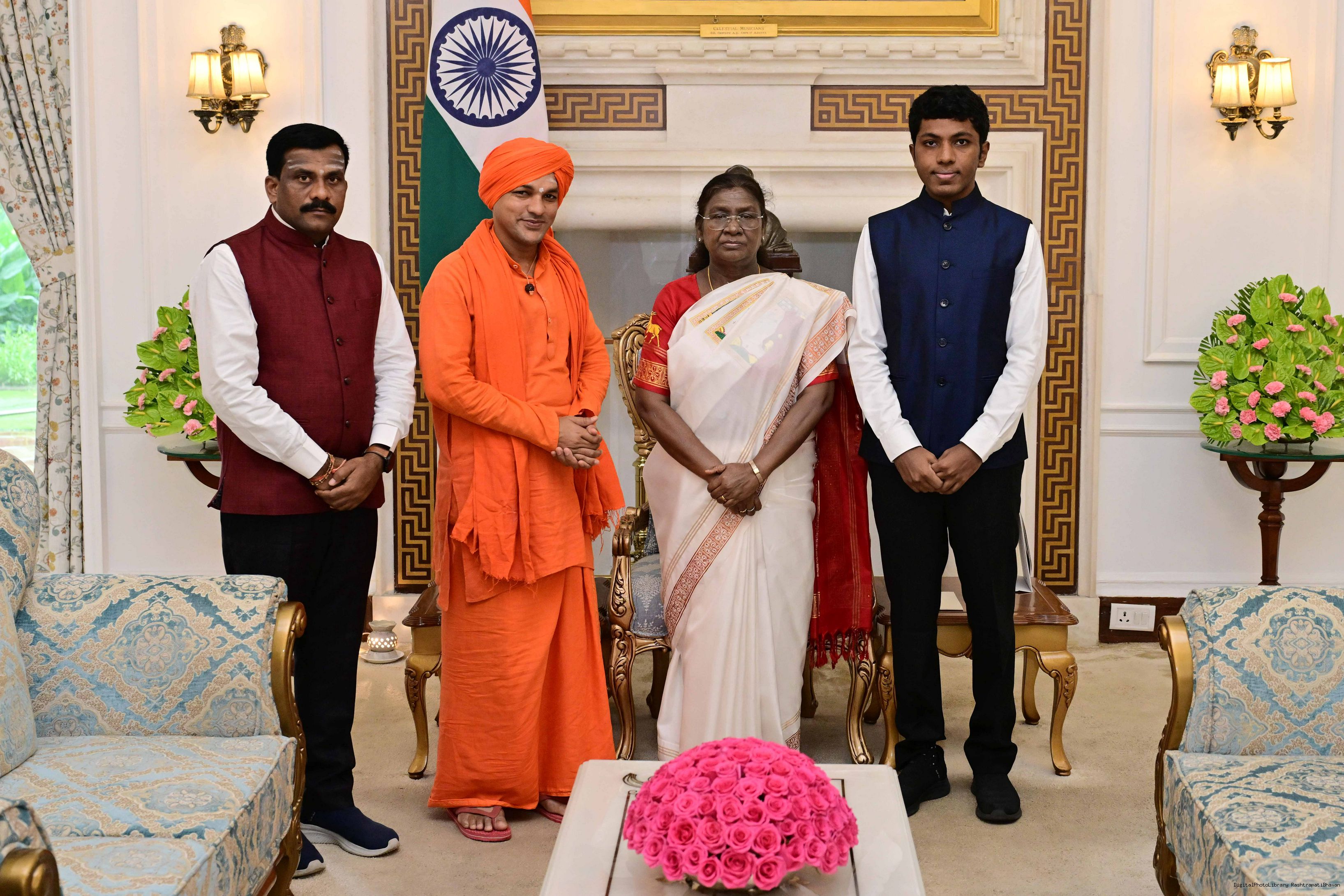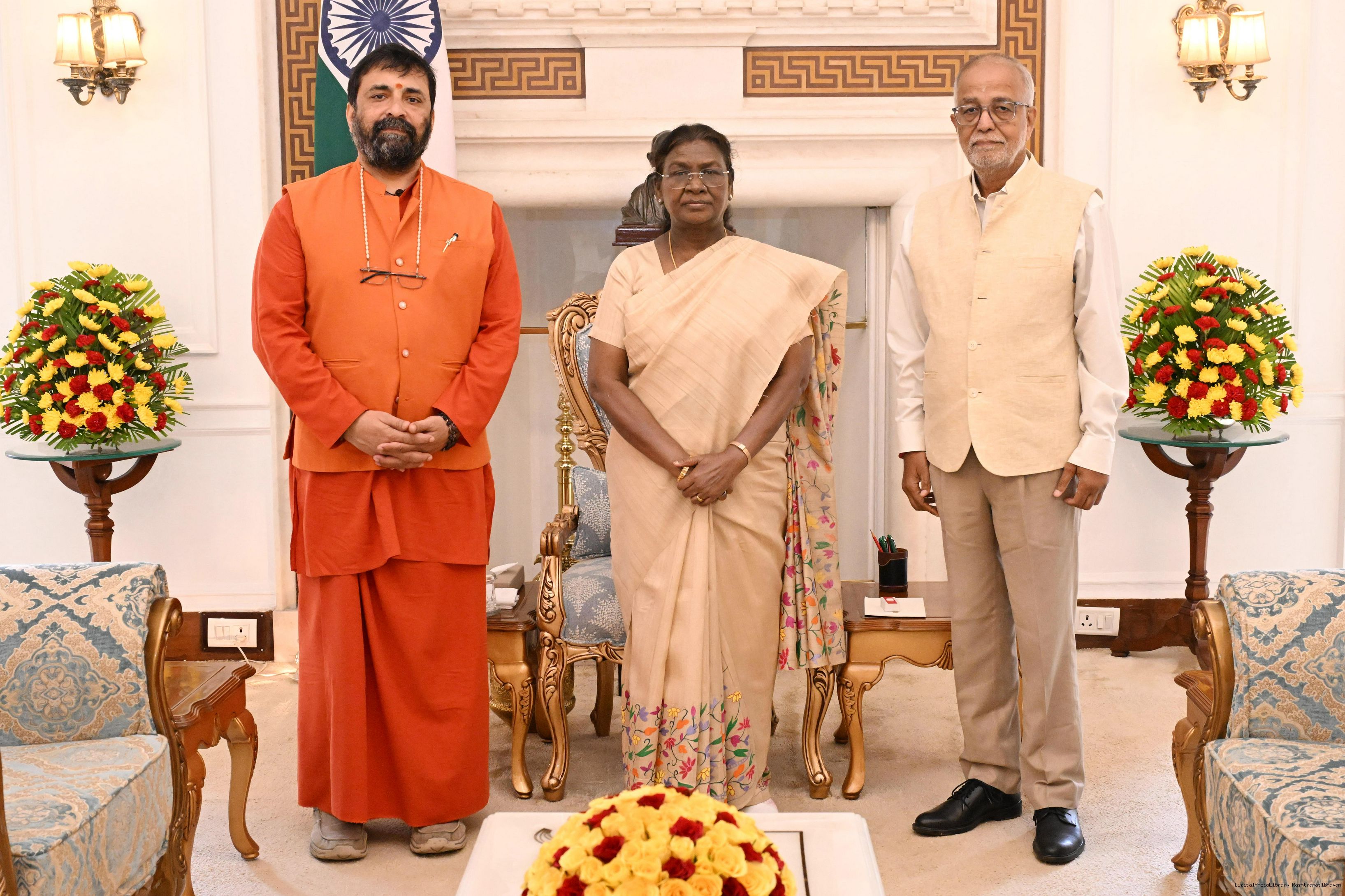Swami Nijamritananda Puri, Head, Delhi Ashram of Mata Amritanandamayi Math along with Shri Satyananda Mishra meeting with the President of India, Smt. Droupadi Murmu at Rashtrapati Bhavan on September 9, 2025.