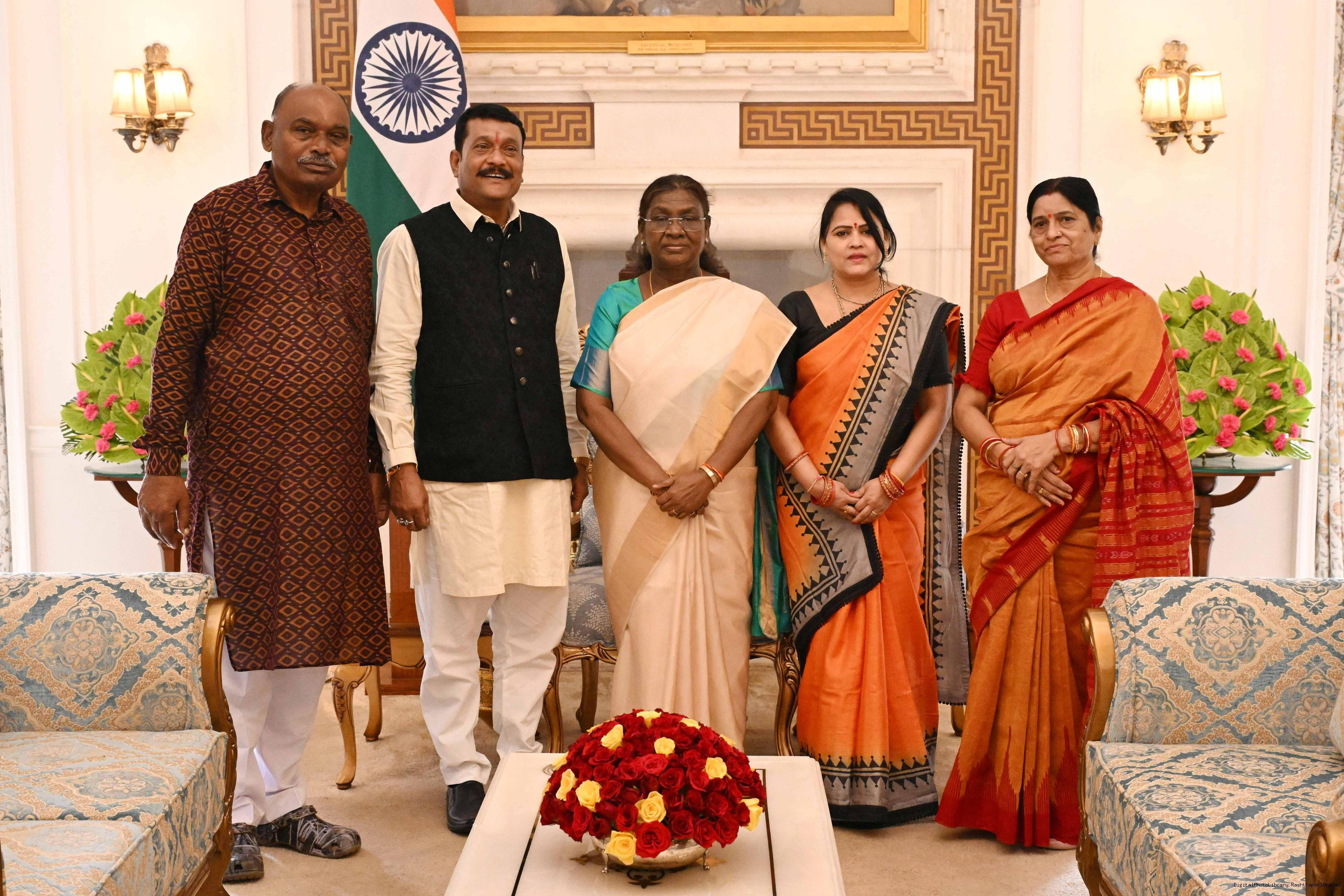 Shri Pradeep Purohit, MP (LS) from Bargarh, Odisha along with spouse and others meeting with the President of India, Smt Droupadi Murmu at Rashtrapati Bhavan on August 18, 2025.