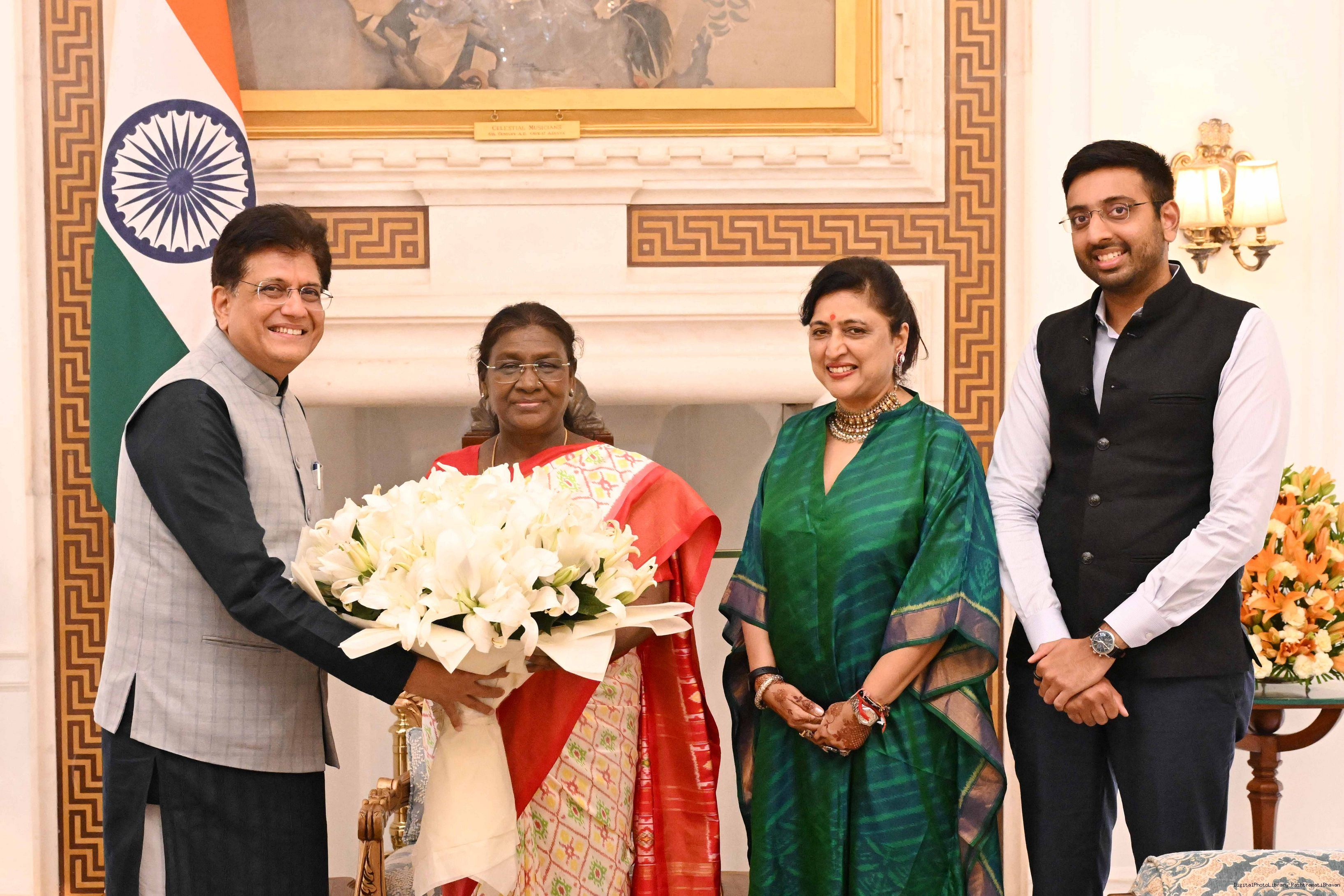 Shri Piyush Goyal, Union Minister of Commerce and Industry with his spouse Smt. Seema Goyal and his Son Shri Dhruv Goyal meeting the President of India, Smt Droupadi Murmu at Rashtrapati Bhavan on August 25, 2025.