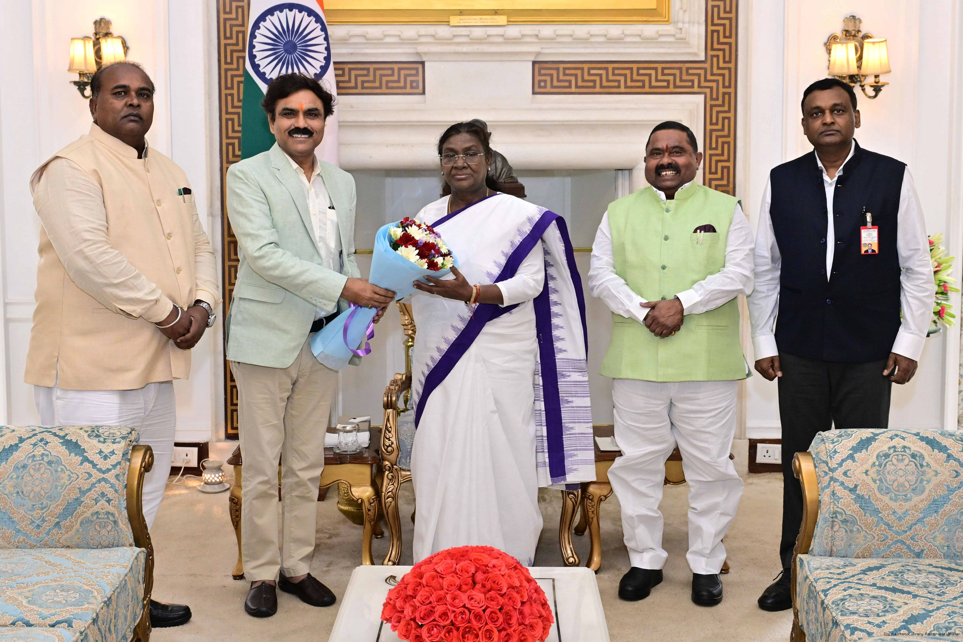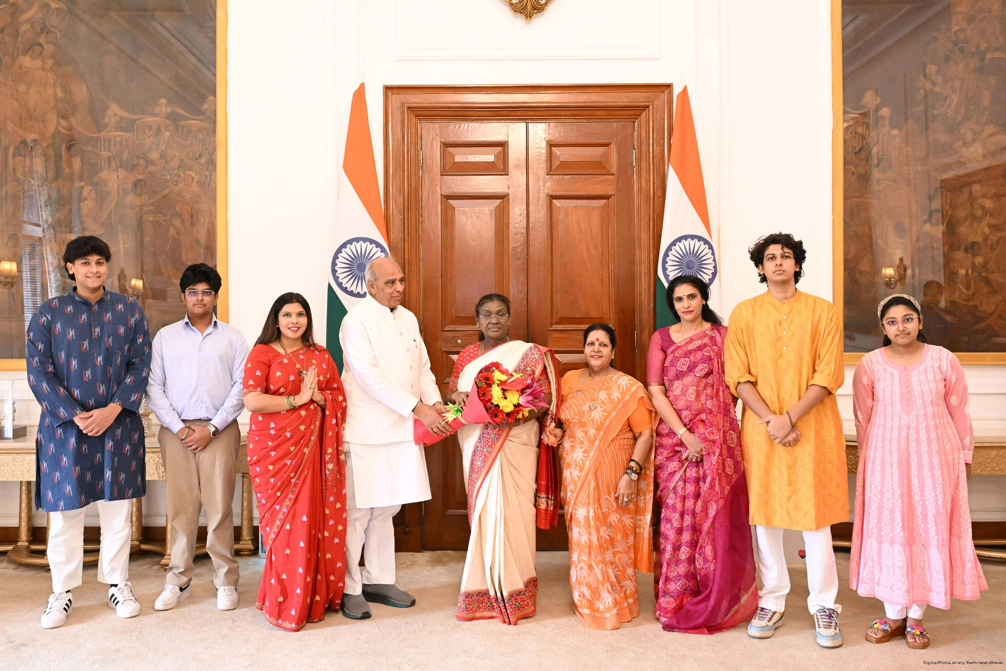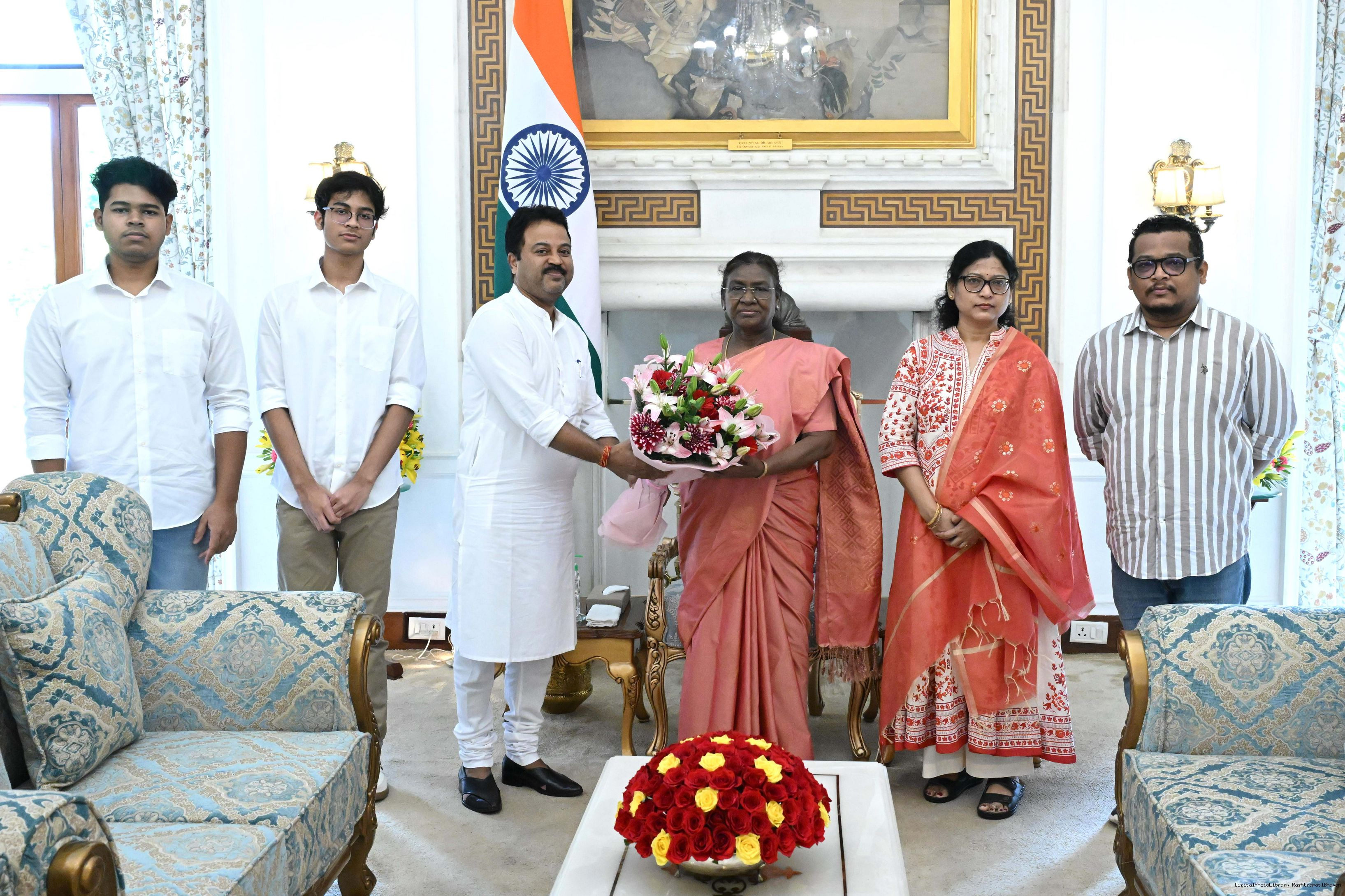 Shri Avimanyu Sethi, Member of Parliament (Lok Sabha) from Bhadrak, Odisha along with wife Smt. Shrabani Priyadarshini along with others meeting with the President of India, Smt. Droupadi Murmu at Rashtrapati Bhavan on July 22, 2025.