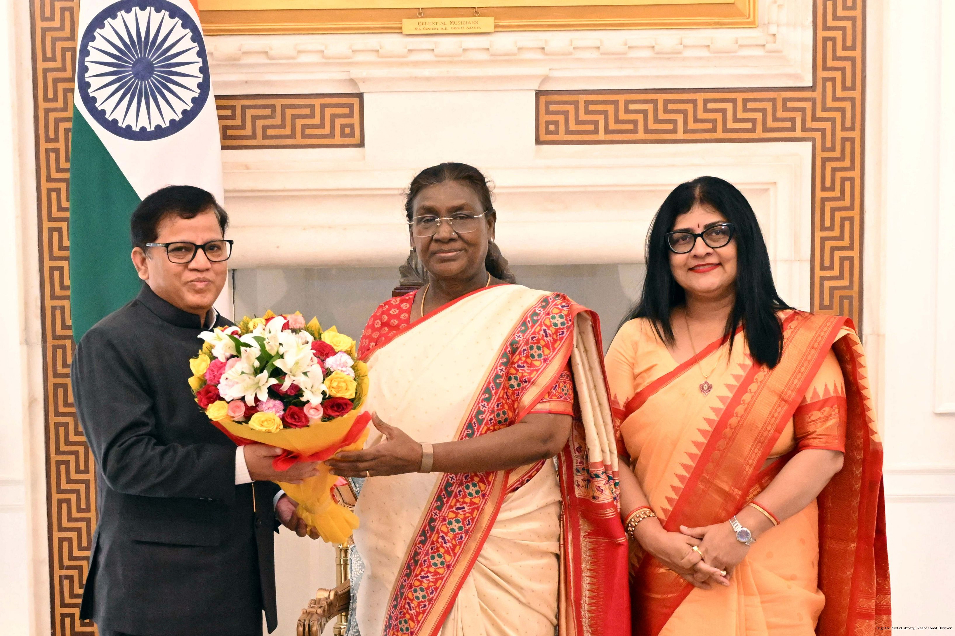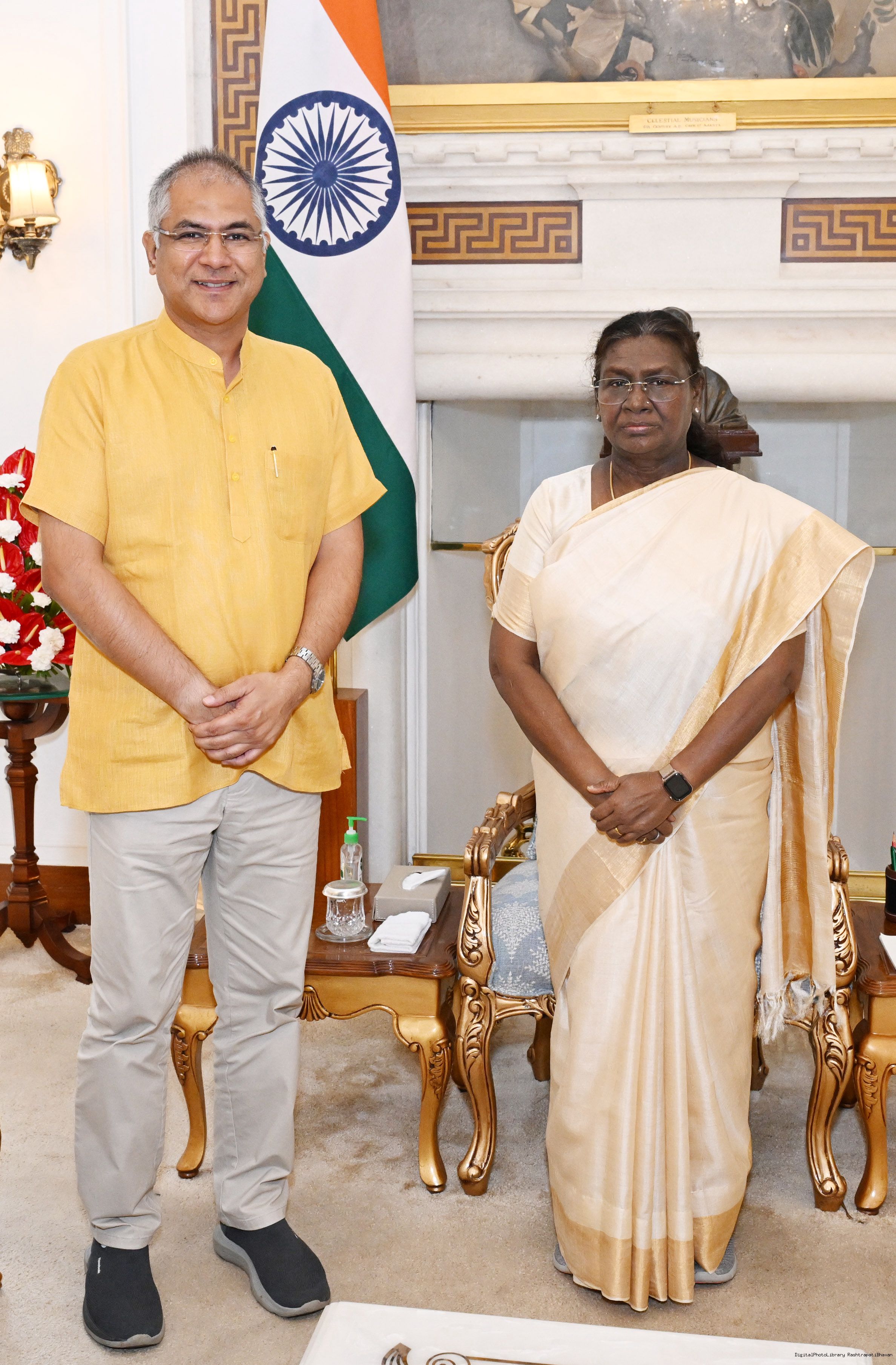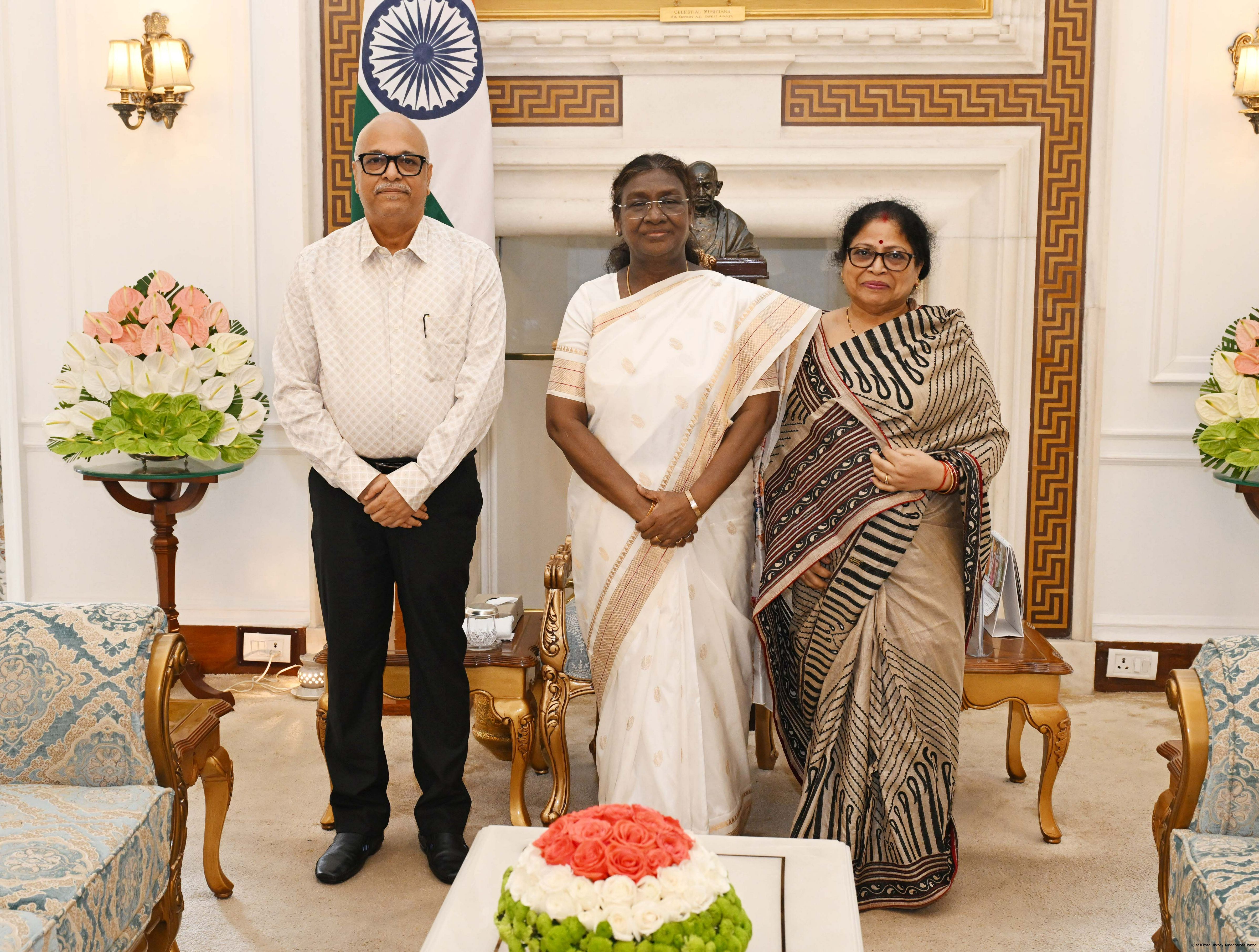 Shri Neeraj Gupta, President, Delhi Art Society along with Smt. Preeti Gupta meeting with the President of India, Smt Droupadi Murmu at Rashtrapati Bhavan on August 13, 2025.