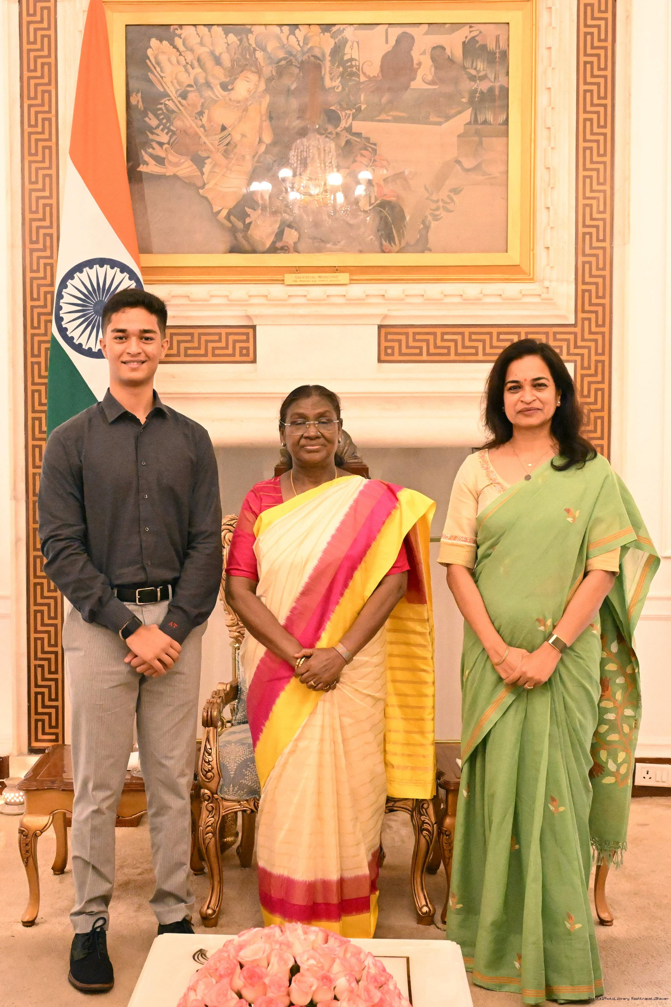 Shri Aadarsh Tripathy, Author, 'The Public's President' along with mother Smt. Roopa Mishra meeting with the President of India, Smt. Droupadi Murmu at Rashtrapati Bhavan on August 5, 2025.
