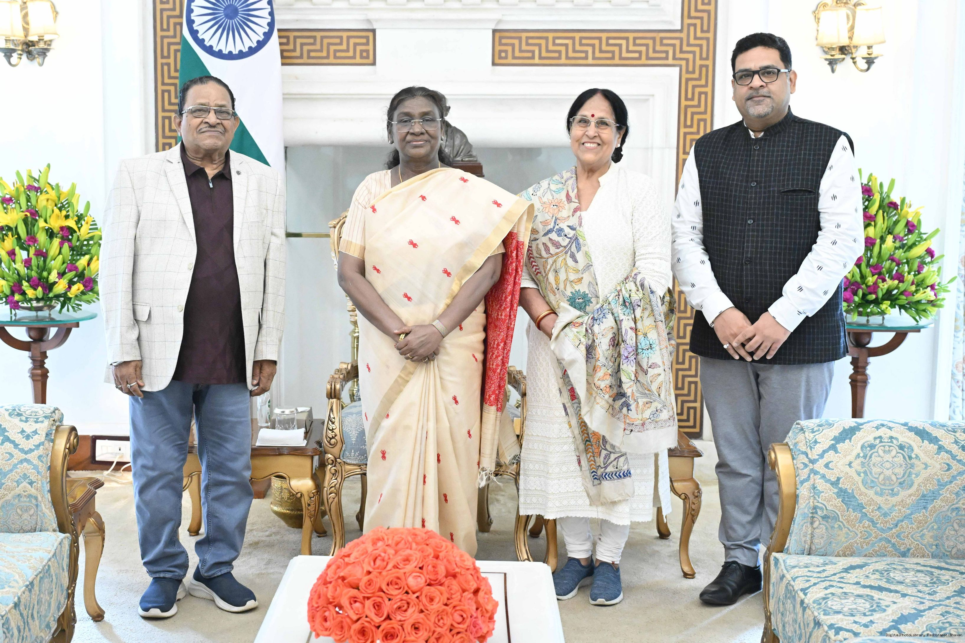 Shri Sissir P. Mishra, Padmashri Dada Saheb Phalke Academy Awardee along with Spouse and others meeting with the President of India, Smt Droupadi Murmu at Rashtrapati Bhavan on August 13, 2025.