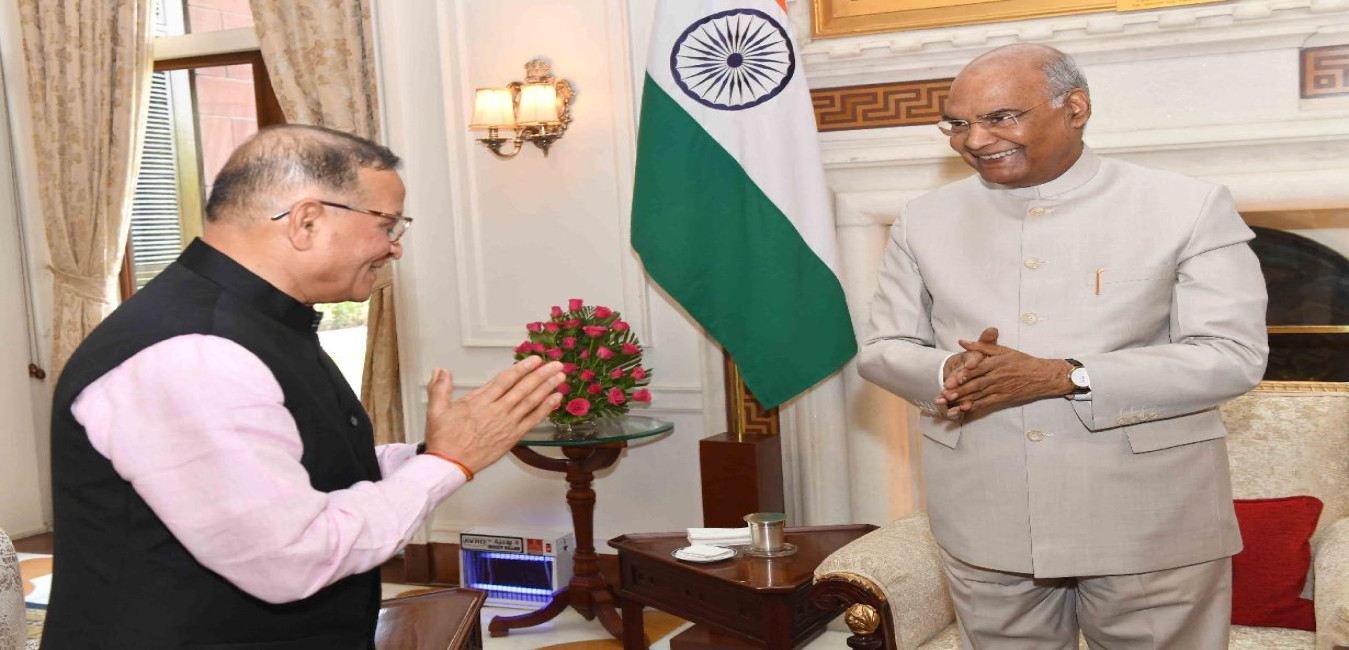 Shri Vijay Guru Jee and Shri PNC Menon meeting with the President of India, Shri Ram Nath Kovind, at Rashtrapati Bhavan on June 21, 2019.