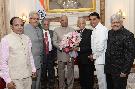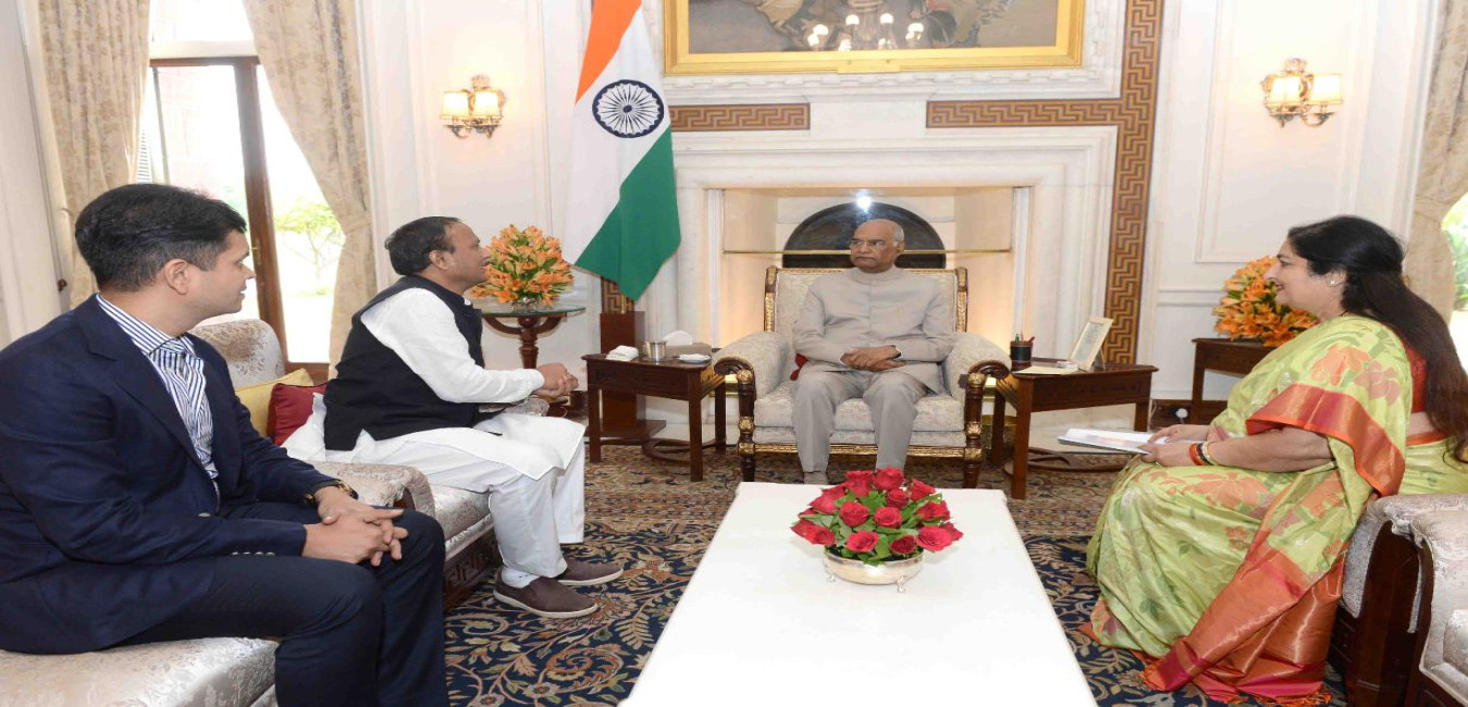 Shri Narayan Singh Kesari, Ex-MP (RS) along with his son Shri Bhupendra Singh Kesari meeting with the President of India, Shri Ram Nath Kovind, at Rashtrapati Bhavan on June 18, 2019.