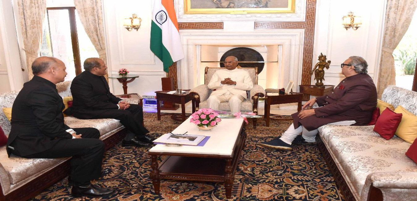 Shri Parvesh Khanna, National General Secretary, Forum for Awareness of National Security (FANS) along with Shri Suresh Jain, Akhil Bharatiya Sanghathan Mantri Bharat Vikas Parishad meeting with the President of India, Shri Ram Nath Kovind, at Rashtrapati Bhavan on April 16, 2019.